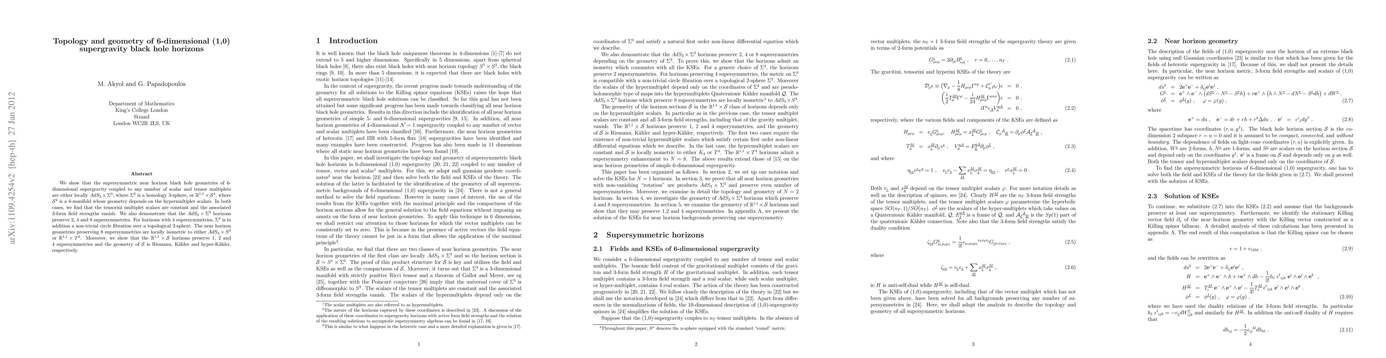 This paper investigates the topology and geometry of near-horizon black hole geometries in 6-dimensional (1,0) supergravity, revealing they are either locally $AdS_3\times \Sigma^3$ or $\bR^{1,1}\times {\cal S}^4$, with specific implications for supersymmetry preservation and scalar field configurations.
