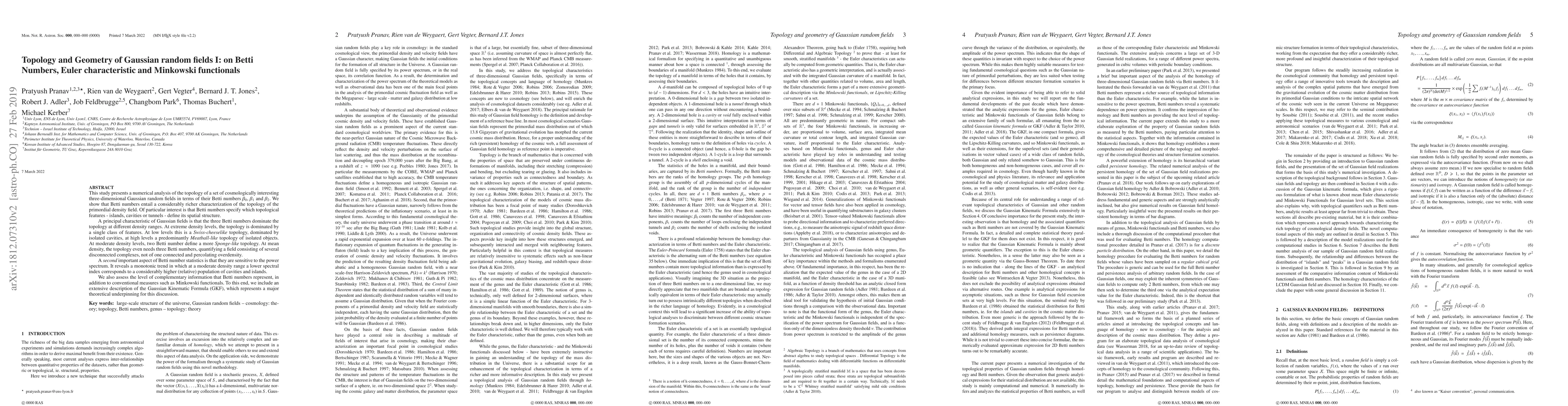 This paper numerically analyzes the topology of three-dimensional Gaussian random fields using Betti numbers, revealing how they characterize features like islands, cavities, and tunnels across different density ranges. It also highlights the sensitivity of Betti numbers to the power spectrum, providing complementary information beyond conventional measures like Minkowski functionals.