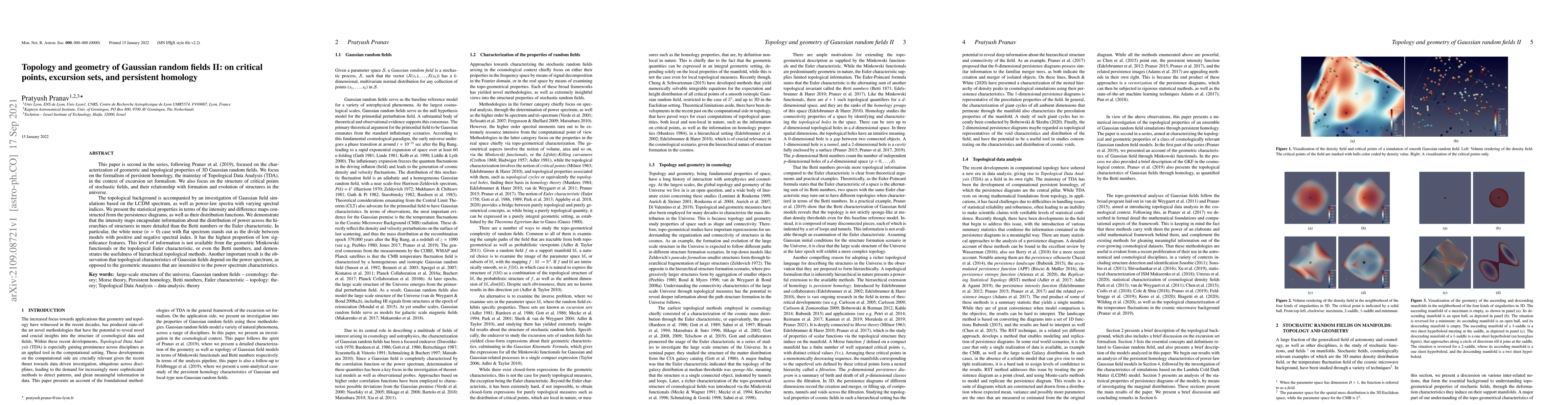 This paper explores the topological and geometric properties of 3D Gaussian random fields using persistent homology and excursion set formalism, focusing on critical points and their cosmological implications. It reveals that intensity maps provide more detailed information about the distribution of power across structures than traditional topological measures, highlighting the significance of hierarchical topological methods.