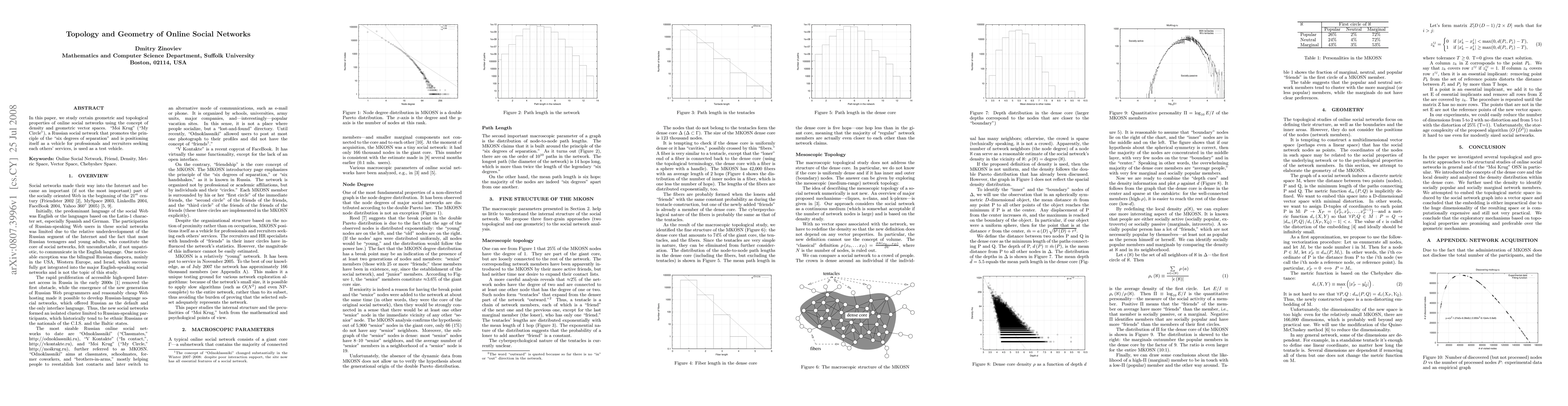 This paper investigates the geometric and topological properties of online social networks, specifically focusing on the Russian platform "Moi Krug" and employing concepts of density and geometric vector spaces to analyze its structure. The study aims to understand the network's adherence to the "six degrees of separation" principle.