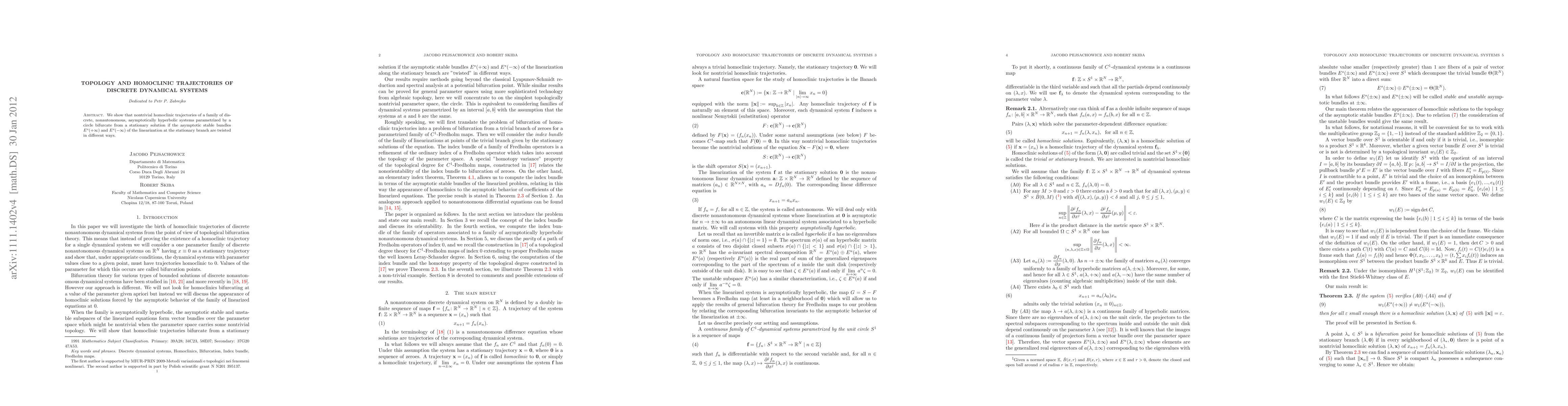 This paper explores how nontrivial homoclinic trajectories in discrete, nonautonomous, asymptotically hyperbolic systems arise from a stationary solution when the asymptotic stable bundles exhibit different twisting behaviors. The study focuses on systems parametrized by a circle.