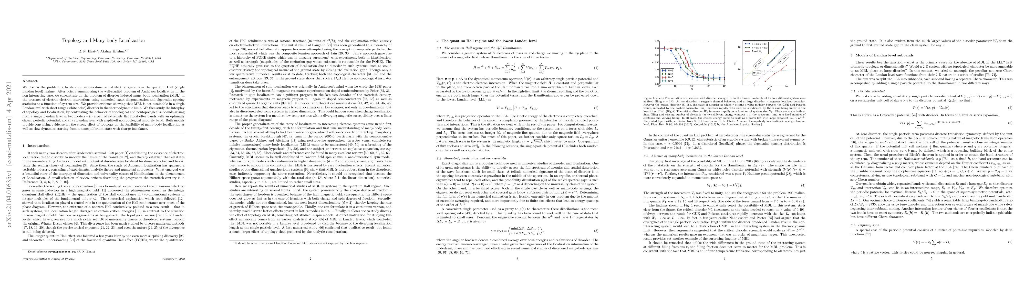 We discuss the problem of localization in two dimensional electron systems in the quantum Hall (single Landau level) regime. After briefly summarizing the well-studied problem of Anderson localization in the non-interacting case, we concentrate on the problem of disorder induced many-body localization (MBL) in the presence of electron-electron interactions using numerical exact diagonalization and eigenvalue spacing statistics as a function of system size. We provide evidence showing that MBL is not attainable in a single Landau level with short range (white noise) disorder in the thermodynamic limit. We then study the interplay of topology and localization, by contrasting the behavior of topological and nontopological subbands arising from a single Landau level in two models - (i) a pair of extremely flat Hofstadter bands with an optimally chosen periodic potential, and (ii) a Landau level with a split-off nontopological impurity band. Both models provide convincing evidence for the strong effect of topology on the feasibility of many-body localization as well as slow dynamics starting from a nonequilibrium state with charge imbalance.