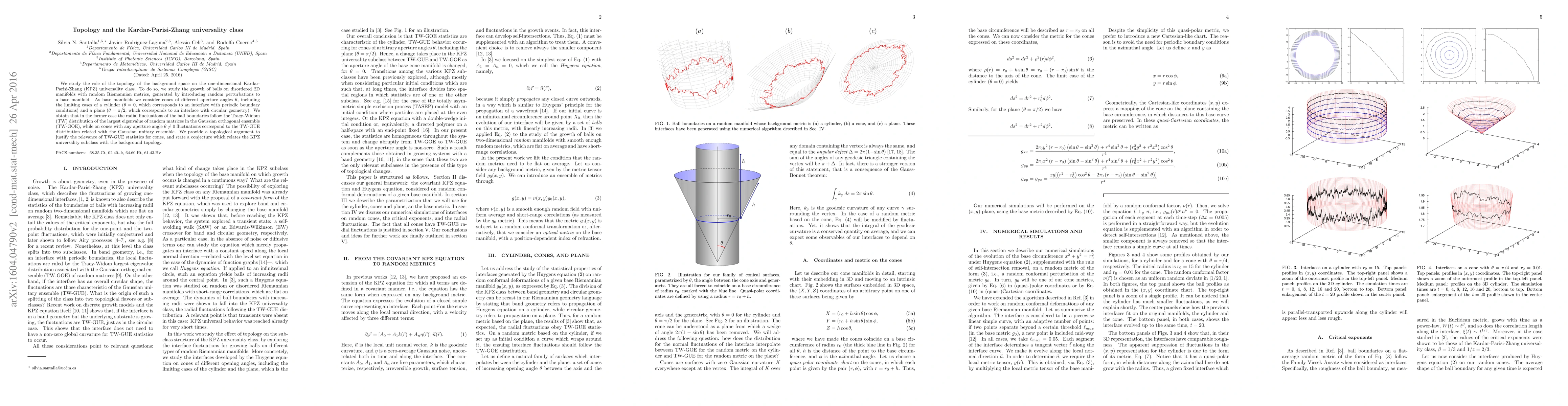 We study the role of the topology of the background space on the one-dimensional Kardar-Parisi-Zhang (KPZ) universality class. To do so, we study the growth of balls on disordered 2D manifolds with random Riemannian metrics, generated by introducing random perturbations to a base manifold. As base manifolds we consider cones of different aperture angles $\theta$, including the limiting cases of a cylinder ($\theta=0$, which corresponds to an interface with periodic boundary conditions) and a plane ($\theta=\pi/2$, which corresponds to an interface with circular geometry). We obtain that in the former case the radial fluctuations of the ball boundaries follow the Tracy-Widom (TW) distribution of the largest eigenvalue of random matrices in the Gaussian orthogonal ensemble (TW-GOE), while on cones with any aperture angle $\theta\neq 0$ fluctuations correspond to the TW-GUE distribution related with the Gaussian unitary ensemble. We provide a topological argument to justify the relevance of TW-GUE statistics for cones, and state a conjecture which relates the KPZ universality subclass with the background topology.