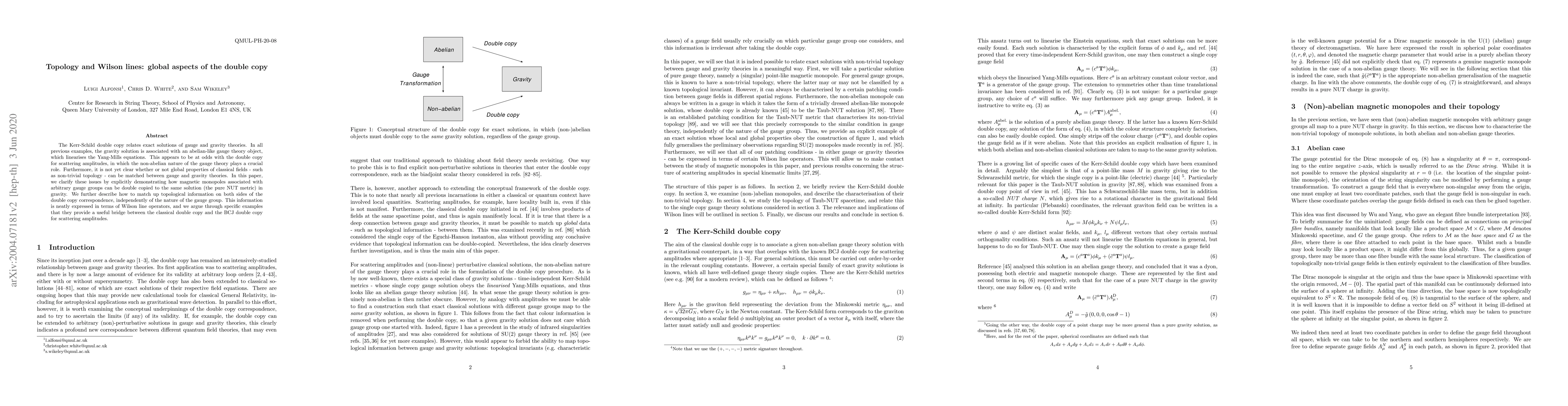 The Kerr-Schild double copy relates exact solutions of gauge and gravity theories. In all previous examples, the gravity solution is associated with an abelian-like gauge theory object, which linearises the Yang-Mills equations. This appears to be at odds with the double copy for scattering amplitudes, in which the non-abelian nature of the gauge theory plays a crucial role. Furthermore, it is not yet clear whether or not global properties of classical fields - such as non-trivial topology - can be matched between gauge and gravity theories. In this paper, we clarify these issues by explicitly demonstrating how magnetic monopoles associated with arbitrary gauge groups can be double copied to the same solution (the pure NUT metric) in gravity. We further describe how to match up topological information on both sides of the double copy correspondence, independently of the nature of the gauge group. This information is neatly expressed in terms of Wilson line operators, and we argue through specific examples that they provide a useful bridge between the classical double copy and the BCJ double copy for scattering amplitudes.