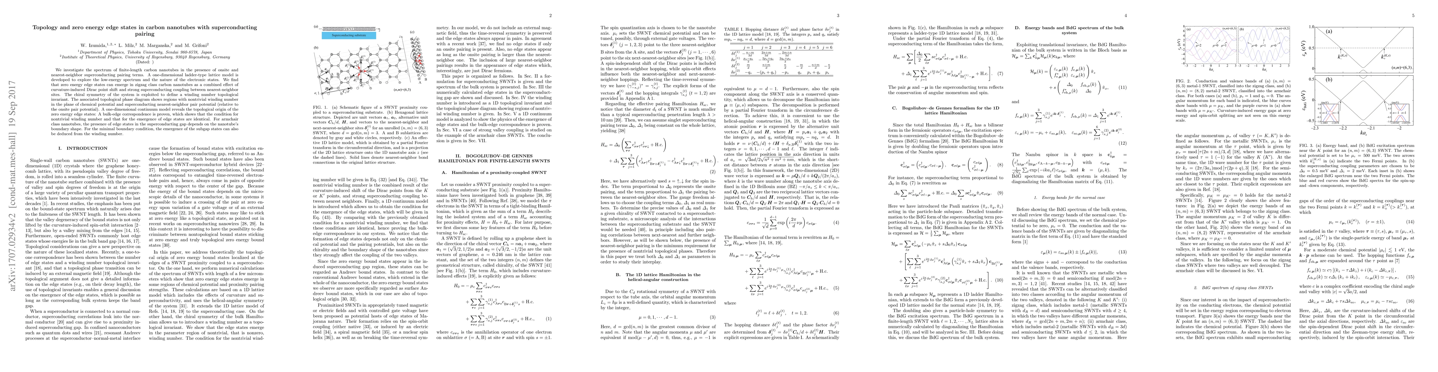 This paper explores the low-energy spectrum of carbon nanotubes with superconducting pairing, revealing zero energy edge states in zigzag nanotubes due to curvature-induced Dirac point shift and strong superconducting coupling. A topological winding number invariant is defined, showing regions of nontrivial winding number in a phase diagram, and confirming a bulk-edge correspondence for these edge states.