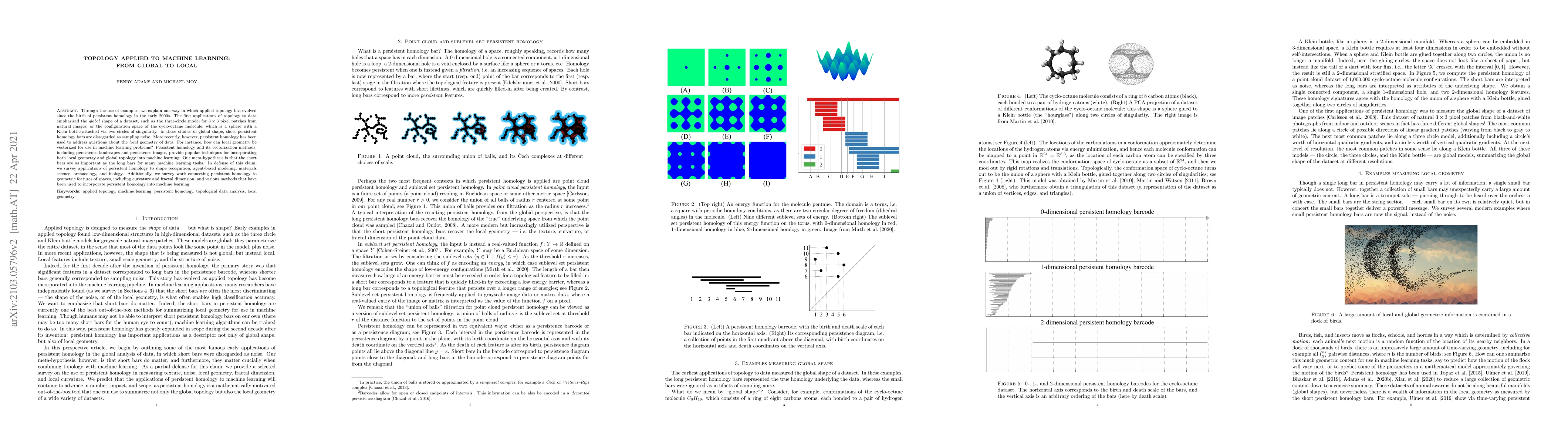Through the use of examples, we explain one way in which applied topology has evolved since the birth of persistent homology in the early 2000s. The first applications of topology to data emphasized the global shape of a dataset, such as the three-circle model for $3 \times 3$ pixel patches from natural images, or the configuration space of the cyclo-octane molecule, which is a sphere with a Klein bottle attached via two circles of singularity. In these studies of global shape, short persistent homology bars are disregarded as sampling noise. More recently, however, persistent homology has been used to address questions about the local geometry of data. For instance, how can local geometry be vectorized for use in machine learning problems? Persistent homology and its vectorization methods, including persistence landscapes and persistence images, provide popular techniques for incorporating both local geometry and global topology into machine learning. Our meta-hypothesis is that the short bars are as important as the long bars for many machine learning tasks. In defense of this claim, we survey applications of persistent homology to shape recognition, agent-based modeling, materials science, archaeology, and biology. Additionally, we survey work connecting persistent homology to geometric features of spaces, including curvature and fractal dimension, and various methods that have been used to incorporate persistent homology into machine learning.