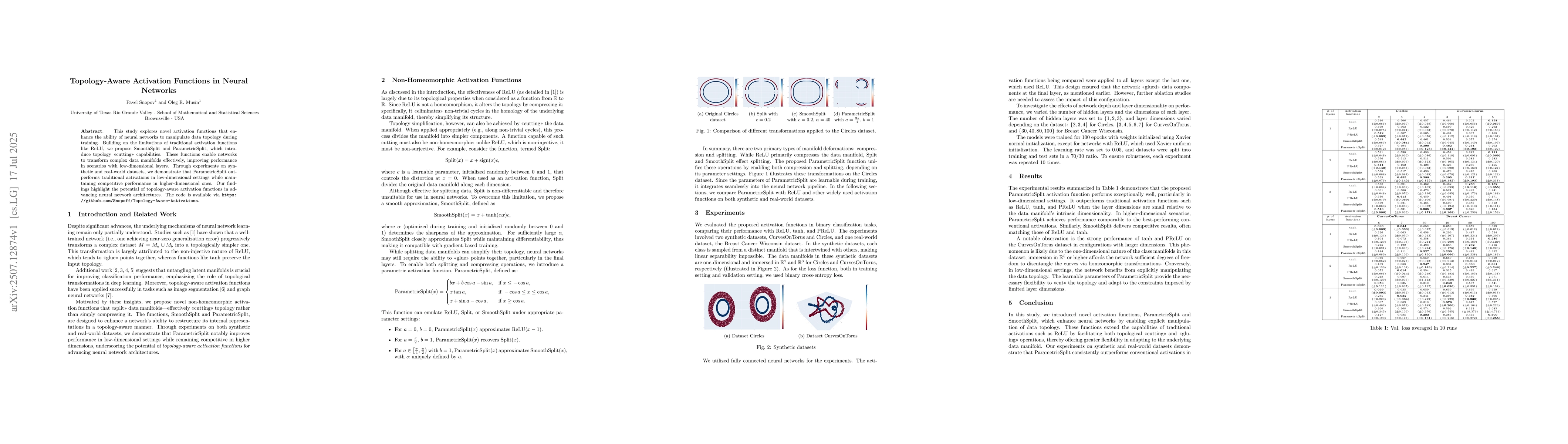 This study explores novel activation functions that enhance the ability of neural networks to manipulate data topology during training. Building on the limitations of traditional activation functions like $\mathrm{ReLU}$, we propose $\mathrm{SmoothSplit}$ and $\mathrm{ParametricSplit}$, which introduce topology "cutting" capabilities. These functions enable networks to transform complex data manifolds effectively, improving performance in scenarios with low-dimensional layers. Through experiments on synthetic and real-world datasets, we demonstrate that $\mathrm{ParametricSplit}$ outperforms traditional activations in low-dimensional settings while maintaining competitive performance in higher-dimensional ones. Our findings highlight the potential of topology-aware activation functions in advancing neural network architectures. The code is available via https://github.com/Snopoff/Topology-Aware-Activations.