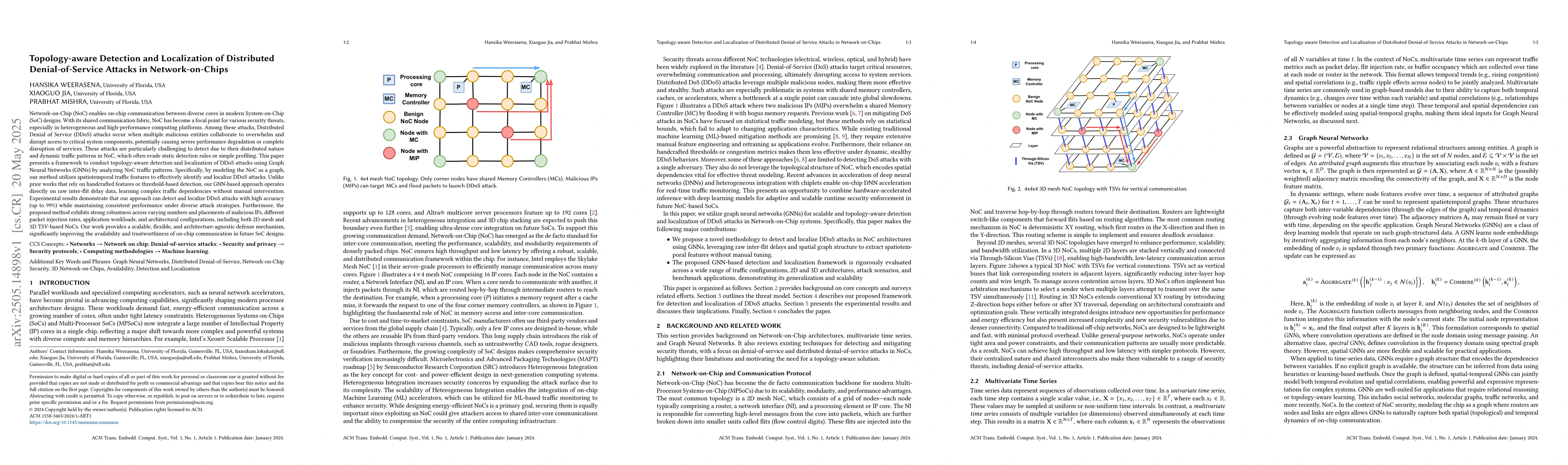 The research proposes a topology-aware detection and localization framework for DDoS attacks in Network-on-Chips (NoC) using Graph Neural Networks (GNNs). It models NoC as a graph, analyzing spatiotemporal traffic features directly from raw inter-flit delay data to identify and localize attacks, unlike previous methods relying on handcrafted features or threshold-based detection.