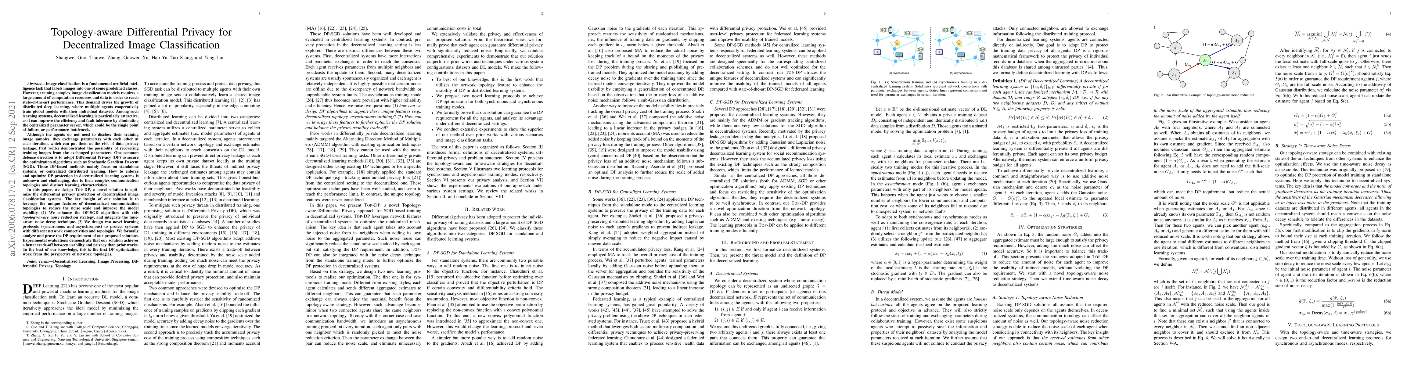 This paper introduces Top-DP, a novel differential privacy optimization for decentralized image classification, leveraging topology-aware noise reduction and time-aware decay techniques. The proposed solution enhances DP-SGD and provides synchronous and asynchronous learning protocols, achieving a better balance between privacy and usability.