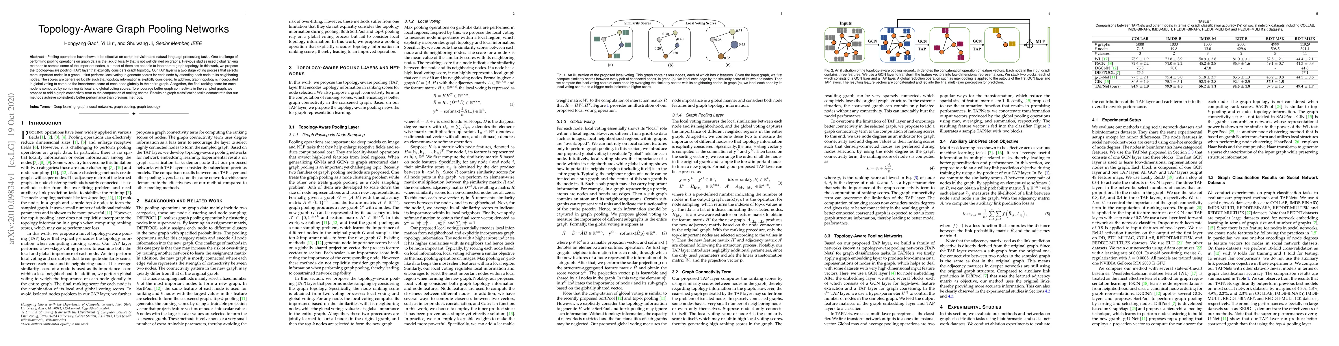 This paper proposes a topology-aware pooling (TAP) layer that enhances graph pooling by explicitly considering graph topology through a two-stage voting process. It combines local and global voting scores to select important nodes while incorporating a graph connectivity term, achieving better performance on graph classification tasks compared to previous methods.