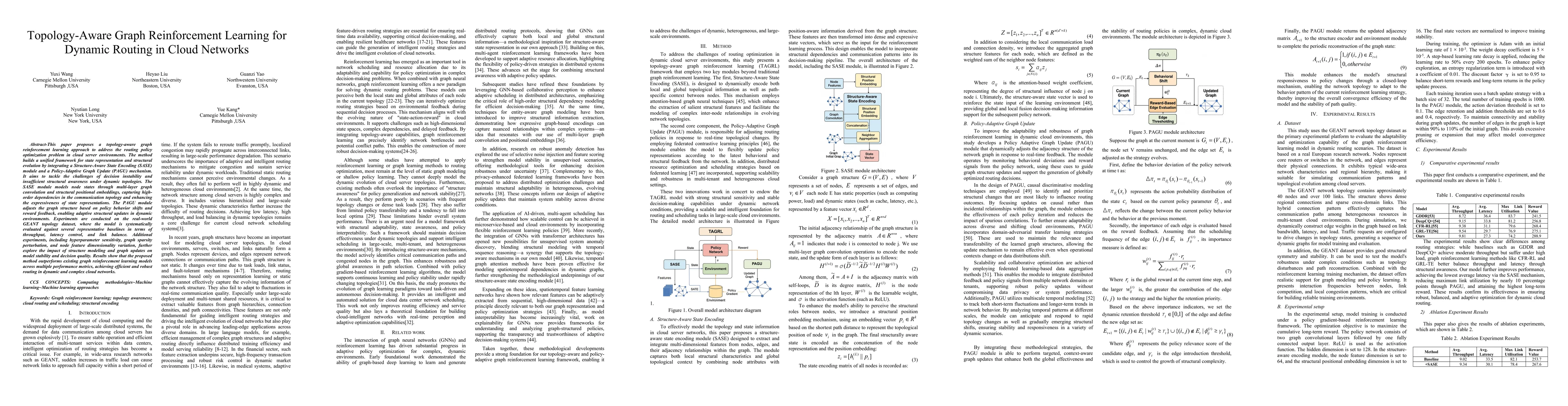This paper proposes a topology-aware graph reinforcement learning approach to address the routing policy optimization problem in cloud server environments. The method builds a unified framework for state representation and structural evolution by integrating a Structure-Aware State Encoding (SASE) module and a Policy-Adaptive Graph Update (PAGU) mechanism. It aims to tackle the challenges of decision instability and insufficient structural awareness under dynamic topologies. The SASE module models node states through multi-layer graph convolution and structural positional embeddings, capturing high-order dependencies in the communication topology and enhancing the expressiveness of state representations. The PAGU module adjusts the graph structure based on policy behavior shifts and reward feedback, enabling adaptive structural updates in dynamic environments. Experiments are conducted on the real-world GEANT topology dataset, where the model is systematically evaluated against several representative baselines in terms of throughput, latency control, and link balance. Additional experiments, including hyperparameter sensitivity, graph sparsity perturbation, and node feature dimensionality variation, further explore the impact of structure modeling and graph updates on model stability and decision quality. Results show that the proposed method outperforms existing graph reinforcement learning models across multiple performance metrics, achieving efficient and robust routing in dynamic and complex cloud networks.