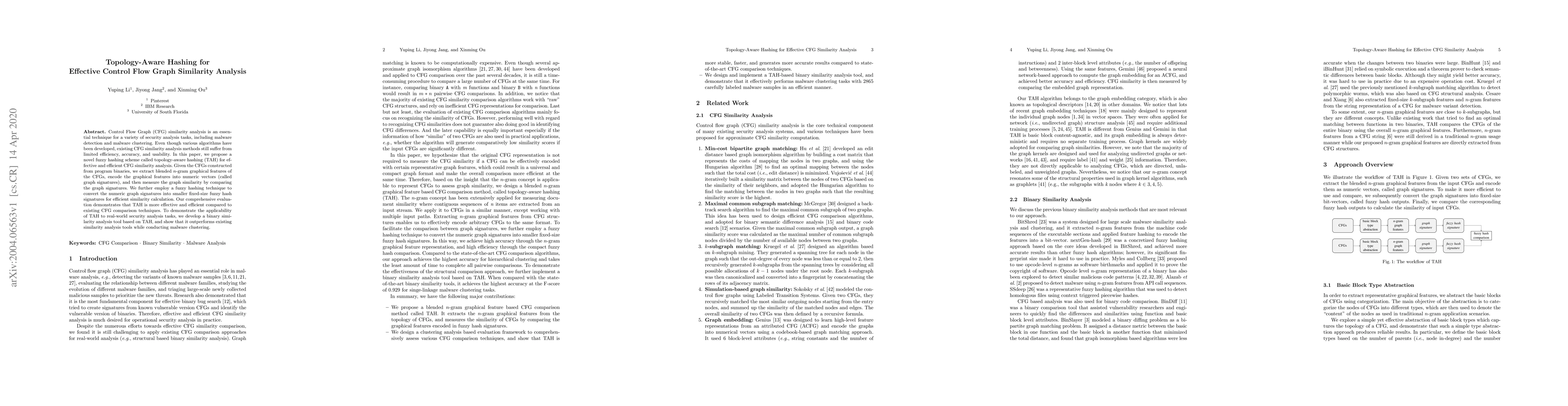 Researchers propose a novel hashing scheme called Topology-Aware Hashing (TAH) to improve control flow graph similarity analysis for security tasks like malware detection and clustering. TAH outperforms existing methods in terms of effectiveness and efficiency.