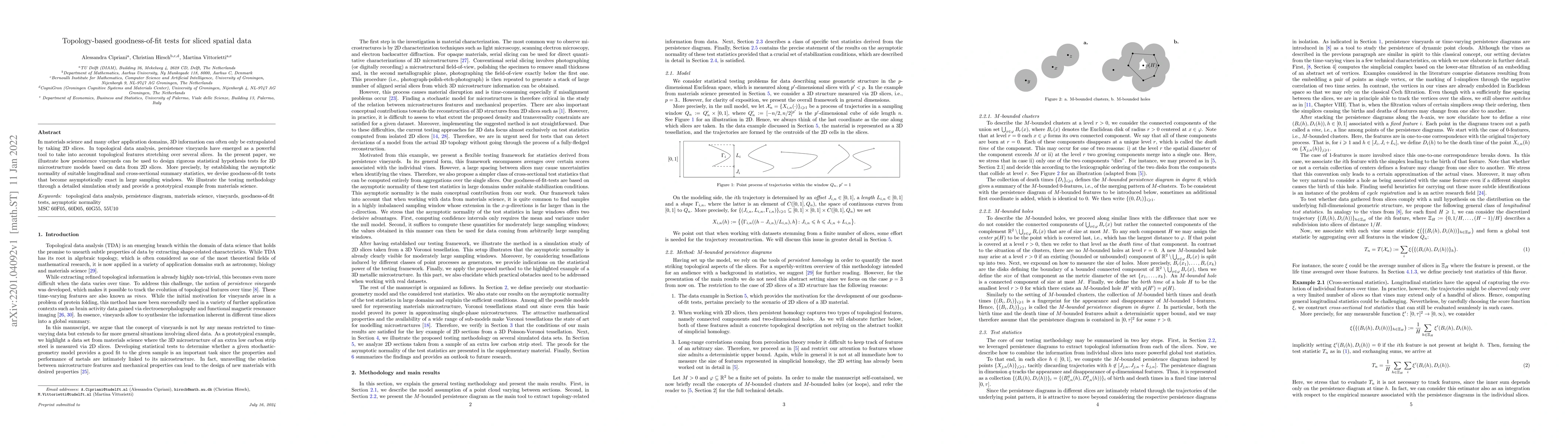 Researchers develop statistical tests for 3D models based on 2D data slices, using topological data analysis to account for features across multiple slices. The tests become asymptotically exact in large samples, providing a rigorous framework for evaluating goodness-of-fit.