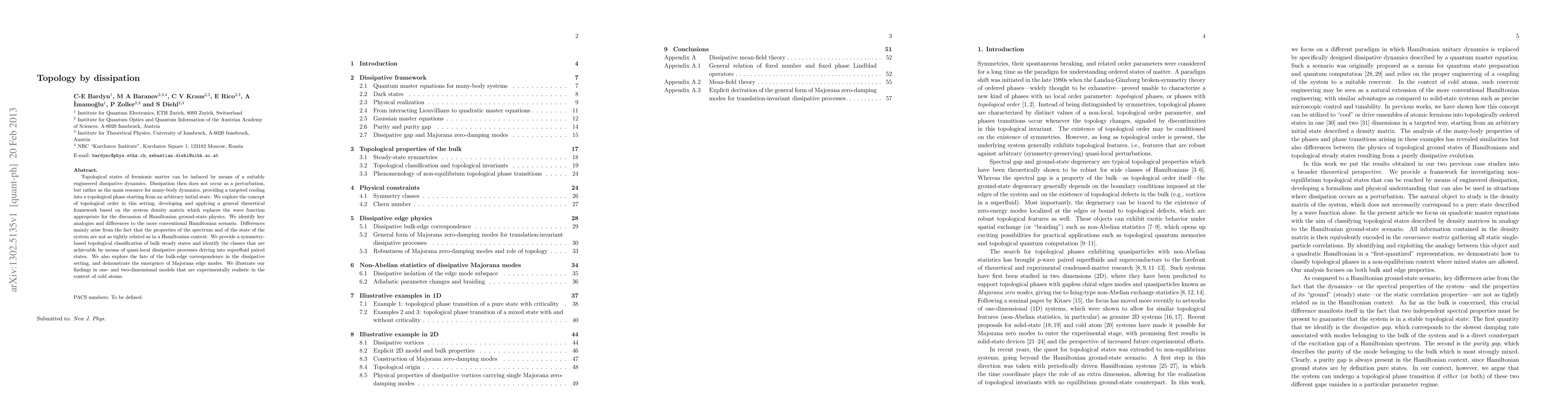 Topological states of fermionic matter can be induced by means of a suitably engineered dissipative dynamics. Dissipation then does not occur as a perturbation, but rather as the main resource for many-body dynamics, providing a targeted cooling into a topological phase starting from an arbitrary initial state. We explore the concept of topological order in this setting, developing and applying a general theoretical framework based on the system density matrix which replaces the wave function appropriate for the discussion of Hamiltonian ground-state physics. We identify key analogies and differences to the more conventional Hamiltonian scenario. Differences mainly arise from the fact that the properties of the spectrum and of the state of the system are not as tightly related as in a Hamiltonian context. We provide a symmetry-based topological classification of bulk steady states and identify the classes that are achievable by means of quasi-local dissipative processes driving into superfluid paired states. We also explore the fate of the bulk-edge correspondence in the dissipative setting, and demonstrate the emergence of Majorana edge modes. We illustrate our findings in one- and two-dimensional models that are experimentally realistic in the context of cold atoms.