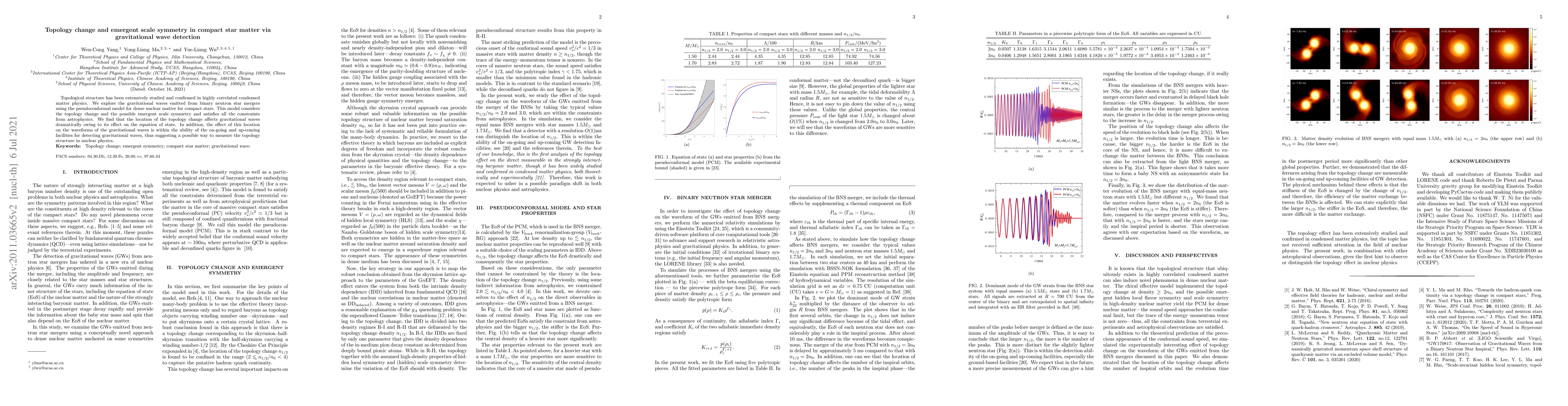 This paper investigates the gravitational waves from neutron star mergers, employing the pseudoconformal model to explore topology changes and emergent scale symmetry in dense nuclear matter. The study finds that the location of topology change significantly influences gravitational wave signals, offering a potential method for detecting these changes via current gravitational wave detection facilities.
