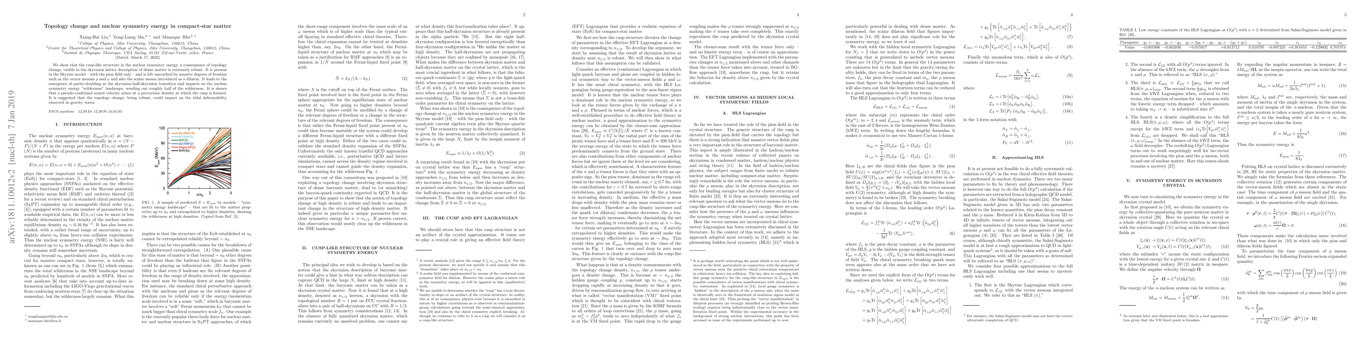 We show that the cusp-like structure in the nuclear symmetry energy, a consequence of topology change, visible in the skyrmion lattice description of dense matter is extremely robust. It is present in the Skyrme model -- with the pion field only -- and is left unscathed by massive degrees of freedom such as the vector mesons $\rho$ and $\omega$ and also the scalar meson introduced as a dilaton. It leads to the emergence of parity-doubling at the skyrmion-half-skyrmion transition and impacts on the nuclear symmetry energy "wilderness" landscape, weeding out roughly half of the wilderness. It is shown that a pseudo-conformal sound velocity arises at a precocious density at which the cusp is formed. It is suggested that the topology change, being robust, could impact on the tidal deformability observed in gravity waves