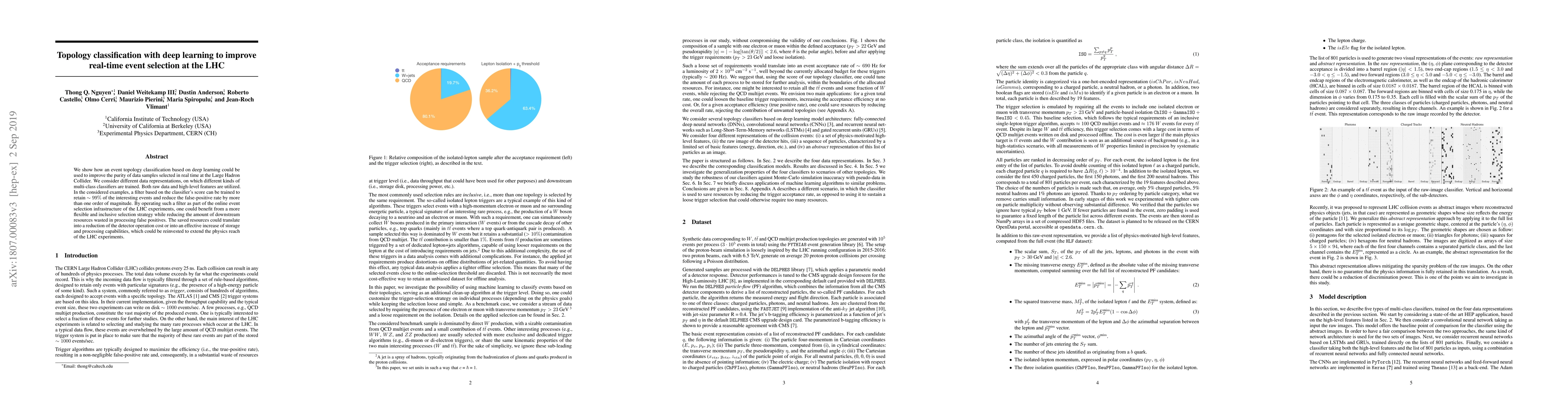 We show how event topology classification based on deep learning could be used to improve the purity of data samples selected in real time at at the Large Hadron Collider. We consider different data representations, on which different kinds of multi-class classifiers are trained. Both raw data and high-level features are utilized. In the considered examples, a filter based on the classifier's score can be trained to retain ~99% of the interesting events and reduce the false-positive rate by as much as one order of magnitude for certain background processes. By operating such a filter as part of the online event selection infrastructure of the LHC experiments, one could benefit from a more flexible and inclusive selection strategy while reducing the amount of downstream resources wasted in processing false positives. The saved resources could be translated into a reduction of the detector operation cost or into an effective increase of storage and processing capabilities, which could be reinvested to extend the physics reach of the LHC experiments.