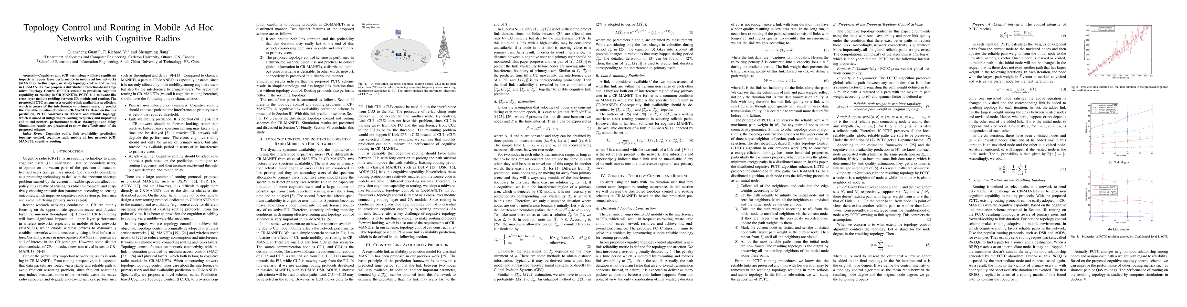 This paper proposes a Prediction-based Cognitive Topology Control (PCTC) scheme for mobile ad hoc networks using cognitive radios, aiming to enhance routing efficiency by predicting link availability and interference to primary users. Simulation results demonstrate improved network performance in terms of throughput and delay.