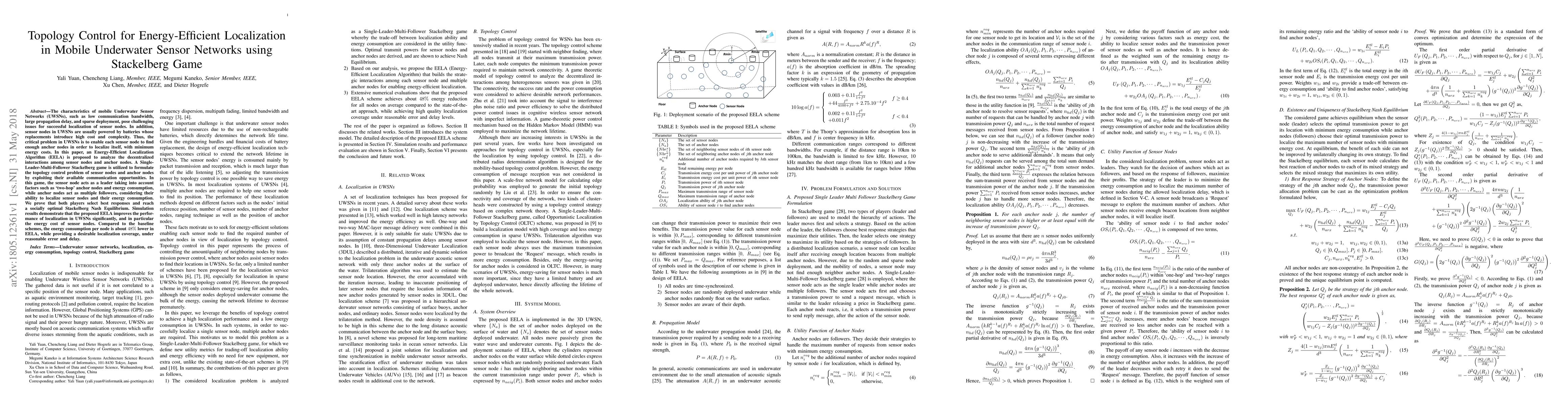 This paper proposes an Energy-Efficient Localization Algorithm (EELA) for mobile Underwater Sensor Networks (UWSNs) using a Stackelberg game to optimize topology control. The algorithm minimizes energy costs by leveraging decentralized interactions among sensor and anchor nodes, achieving a socially optimal equilibrium and significantly reducing energy consumption by about 48% compared to baseline schemes.