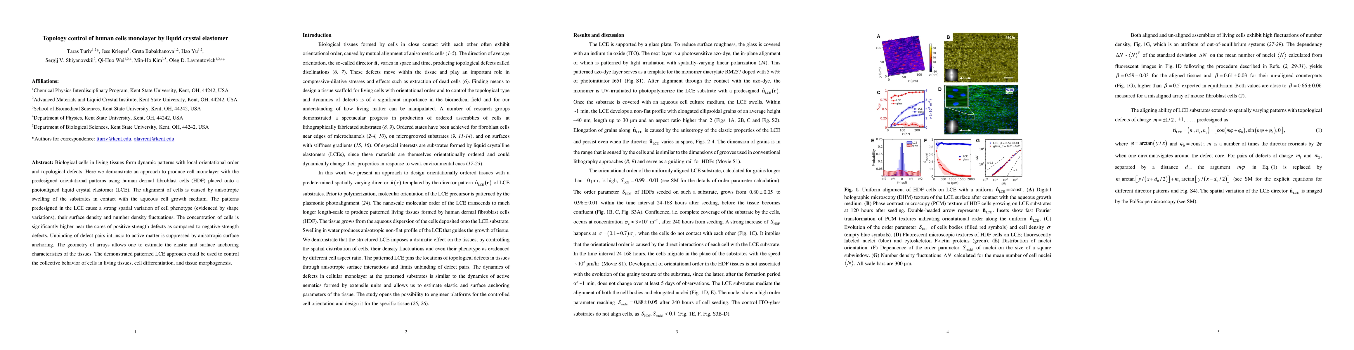 This paper demonstrates a method to control the orientation and pattern of human dermal fibroblast cells using a photoaligned liquid crystal elastomer, showing significant spatial variations in cell phenotype, density, and defect interactions. The approach could influence cell differentiation and tissue morphogenesis.