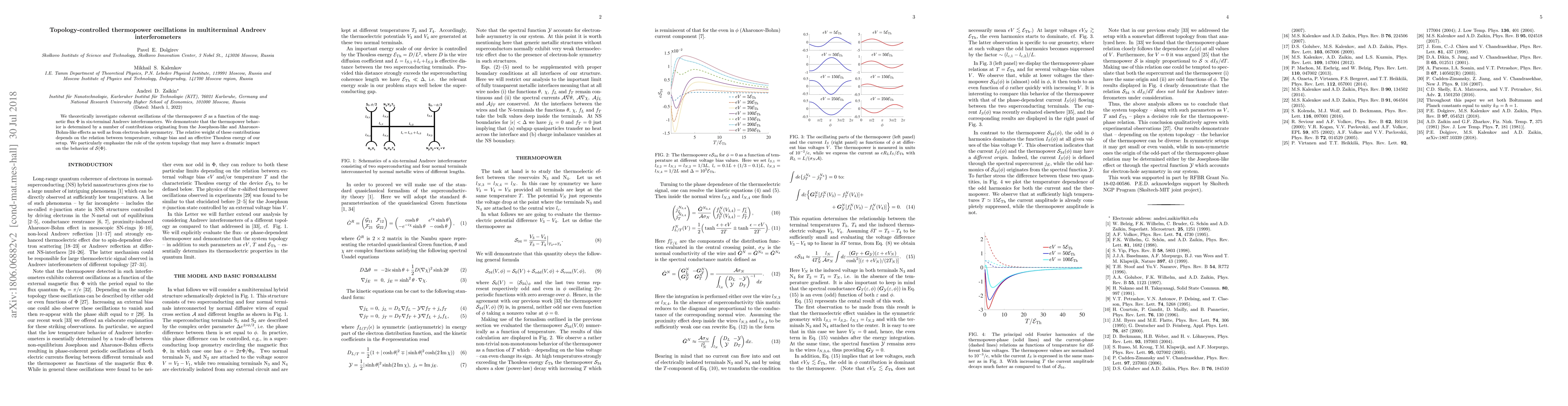 This paper theoretically explores the thermopower oscillations in six-terminal Andreev interferometers, revealing that the oscillations are influenced by Josephson-like, Aharonov-Bohm-like effects, and electron-hole asymmetry, with the system's topology significantly affecting the thermopower behavior.