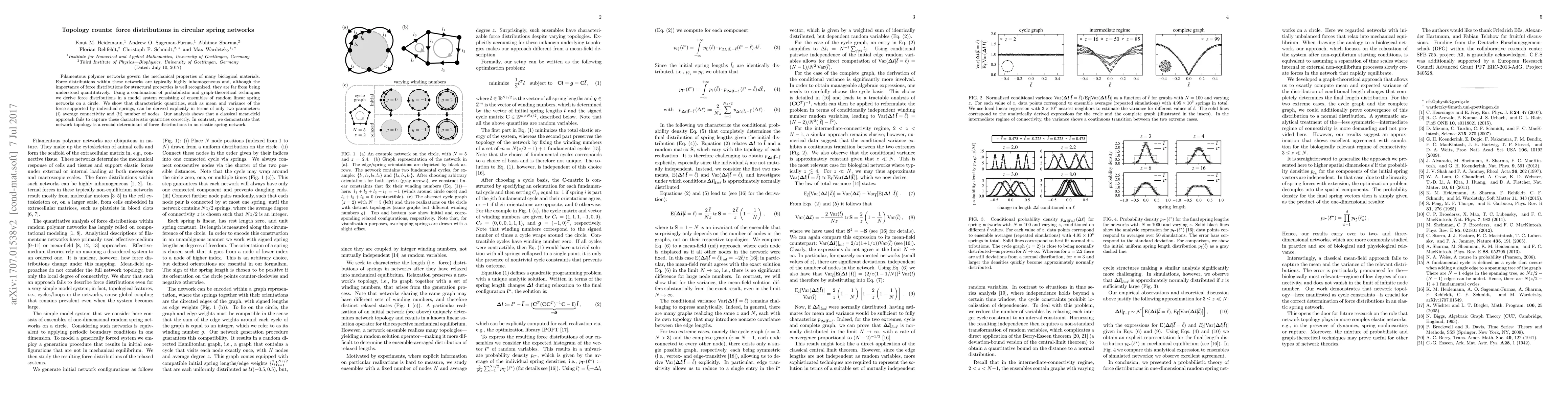 This paper uses probabilistic and graph-theoretical methods to analyze force distributions in circular spring networks, showing that network topology, specifically average connectivity and number of nodes, determines these distributions more accurately than a mean-field approach. The study highlights the importance of network topology in understanding mechanical properties of filamentous polymer networks.