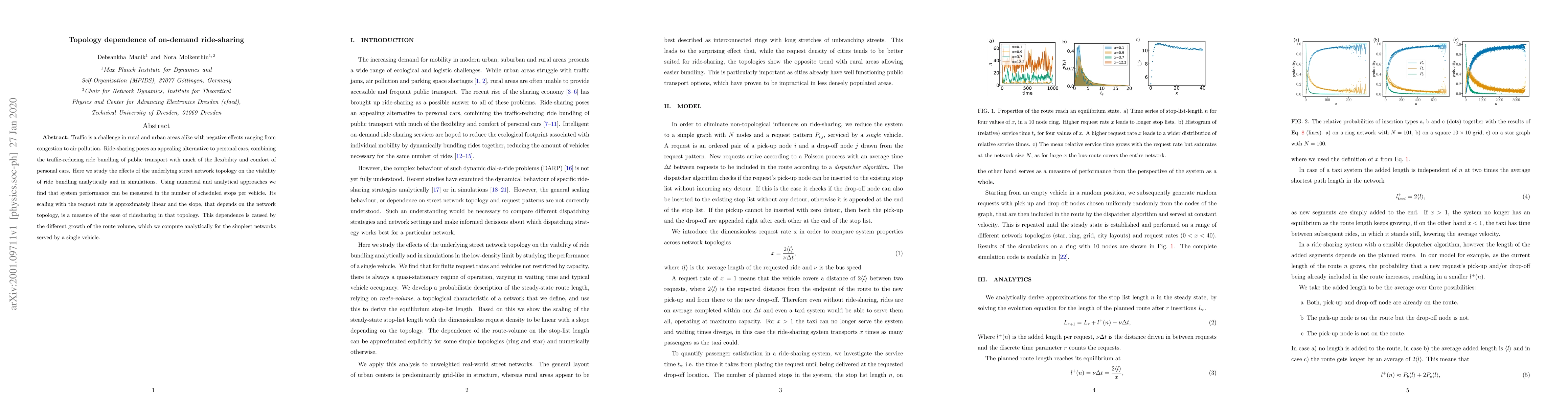Ride-sharing viability depends on street network topology, with system performance measured in scheduled stops per vehicle, linearly scaling with request rate. Topology's impact varies due to differing route volume growth.