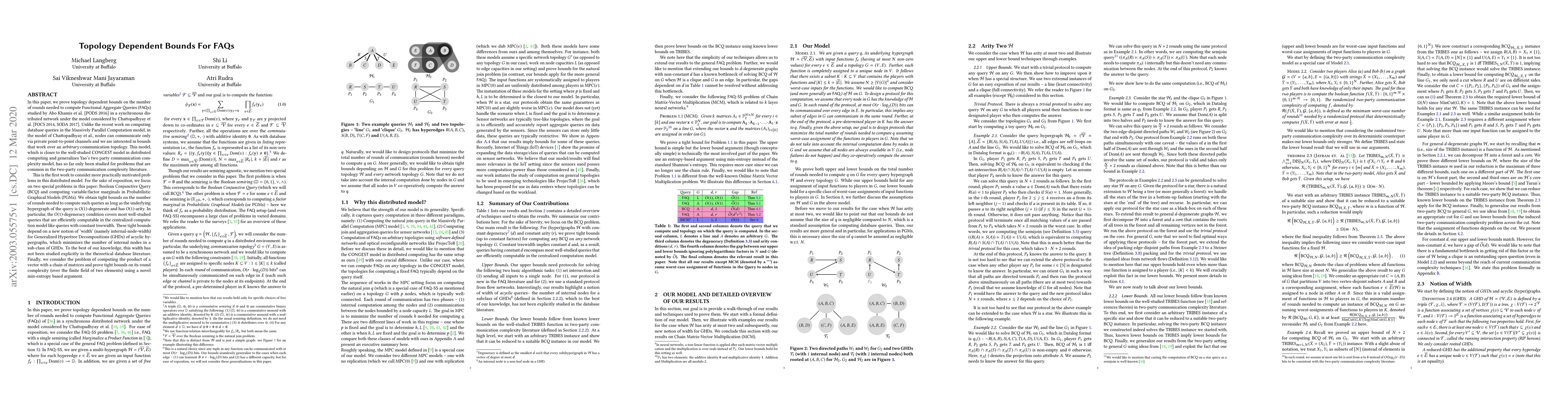 In this paper, we prove topology dependent bounds on the number of rounds needed to compute Functional Aggregate Queries (FAQs) studied by Abo Khamis et al. [PODS 2016] in a synchronous distributed network under the model considered by Chattopadhyay et al. [FOCS 2014, SODA 2017]. Unlike the recent work on computing database queries in the Massively Parallel Computation model, in the model of Chattopadhyay et al., nodes can communicate only via private point-to-point channels and we are interested in bounds that work over an {\em arbitrary} communication topology. This is the first work to consider more practically motivated problems in this distributed model. For the sake of exposition, we focus on two special problems in this paper: Boolean Conjunctive Query (BCQ) and computing variable/factor marginals in Probabilistic Graphical Models (PGMs). We obtain tight bounds on the number of rounds needed to compute such queries as long as the underlying hypergraph of the query is $O(1)$-degenerate and has $O(1)$-arity. In particular, the $O(1)$-degeneracy condition covers most well-studied queries that are efficiently computable in the centralized computation model like queries with constant treewidth. These tight bounds depend on a new notion of `width' (namely internal-node-width) for Generalized Hypertree Decompositions (GHDs) of acyclic hypergraphs, which minimizes the number of internal nodes in a sub-class of GHDs. To the best of our knowledge, this width has not been studied explicitly in the theoretical database literature. Finally, we consider the problem of computing the product of a vector with a chain of matrices and prove tight bounds on its round complexity (over the finite field of two elements) using a novel min-entropy based argument.