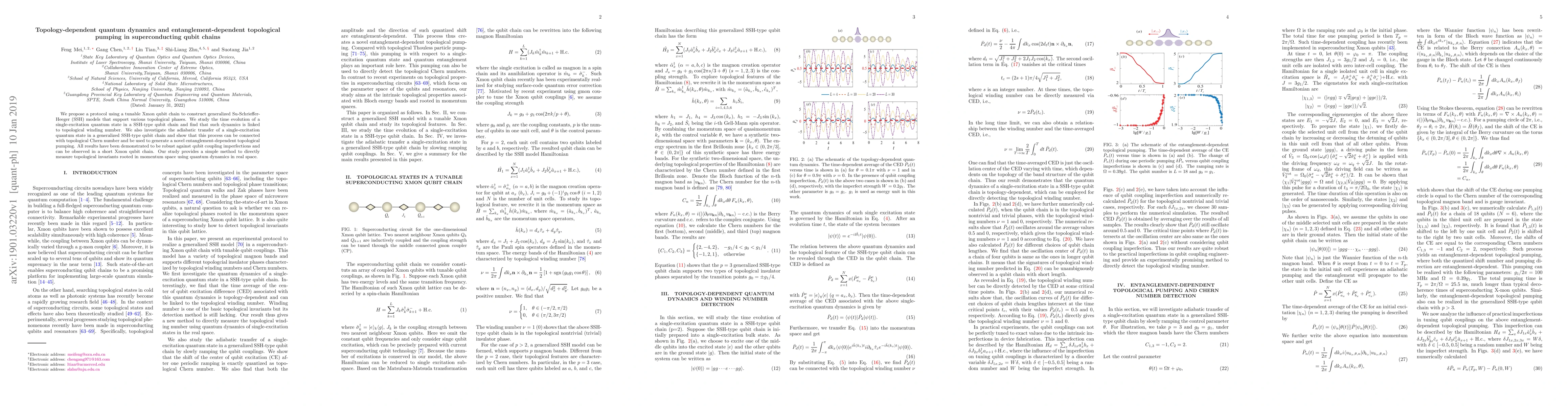 The paper presents a protocol using a tunable Xmon qubit chain to create generalized Su-Schrieffer-Heeger (SSH) models, demonstrating that quantum state dynamics are linked to topological winding numbers. Adiabatic transfer of single-excitation states in these chains generates entanglement-dependent topological pumping, robust against qubit coupling imperfections, and can be observed in short qubit chains. This method offers a simple way to measure topological invariants in momentum space via quantum dynamics in real space.