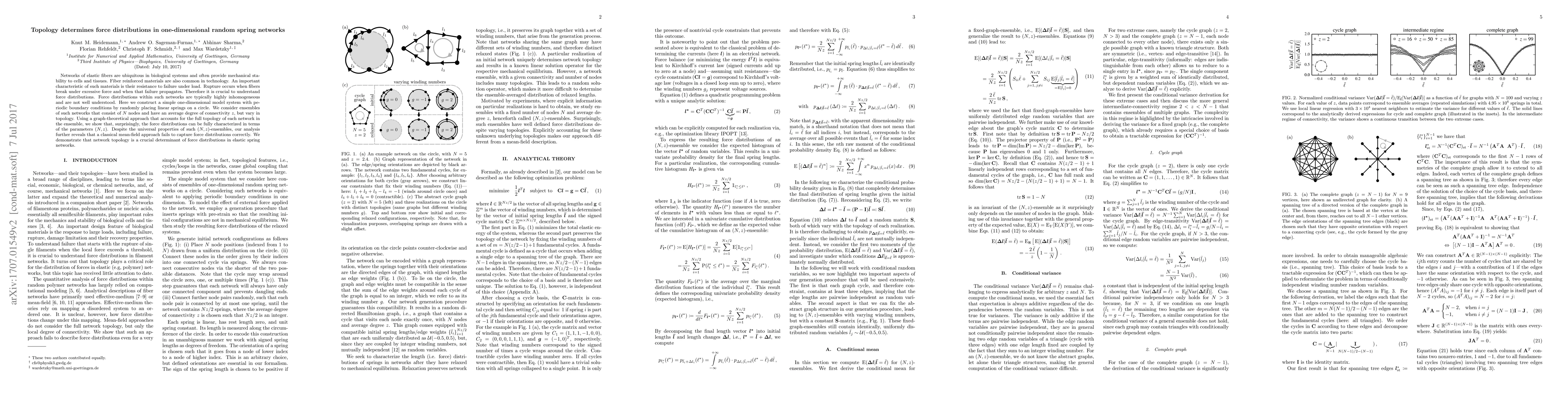 Networks of elastic fibers are ubiquitous in biological systems and often provide mechanical stability to cells and tissues. Fiber reinforced materials are also common in technology. An important characteristic of such materials is their resistance to failure under load. Rupture occurs when fibers break under excessive force and when that failure propagates. Therefore it is crucial to understand force distributions. Force distributions within such networks are typically highly inhomogeneous and are not well understood. Here we construct a simple one-dimensional model system with periodic boundary conditions by randomly placing linear springs on a circle. We consider ensembles of such networks that consist of $N$ nodes and have an average degree of connectivity $z$, but vary in topology. Using a graph-theoretical approach that accounts for the full topology of each network in the ensemble, we show that, surprisingly, the force distributions can be fully characterized in terms of the parameters $(N,z)$. Despite the universal properties of such $(N,z)$-ensembles, our analysis further reveals that a classical mean-field approach fails to capture force distributions correctly. We demonstrate that network topology is a crucial determinant of force distributions in elastic spring networks.