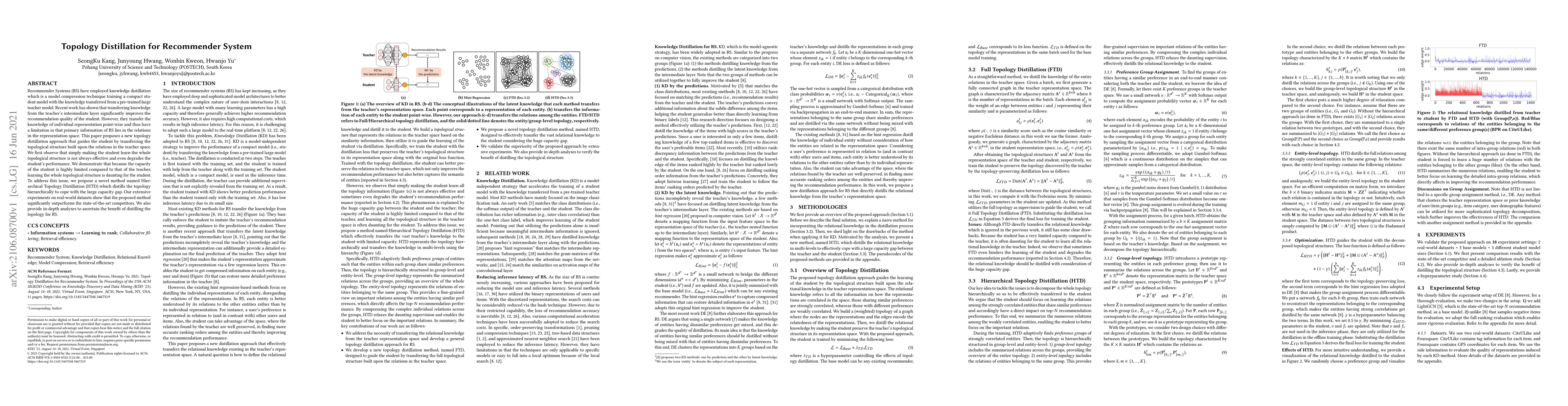 This paper introduces Hierarchical Topology Distillation (HTD) to improve recommender systems by transferring the topological structure from a teacher model to a student model, addressing the limitations of point-wise knowledge transfer. The proposed method hierarchically distills the topology to manage the capacity gap, significantly outperforming existing methods in experiments on real-world datasets.
