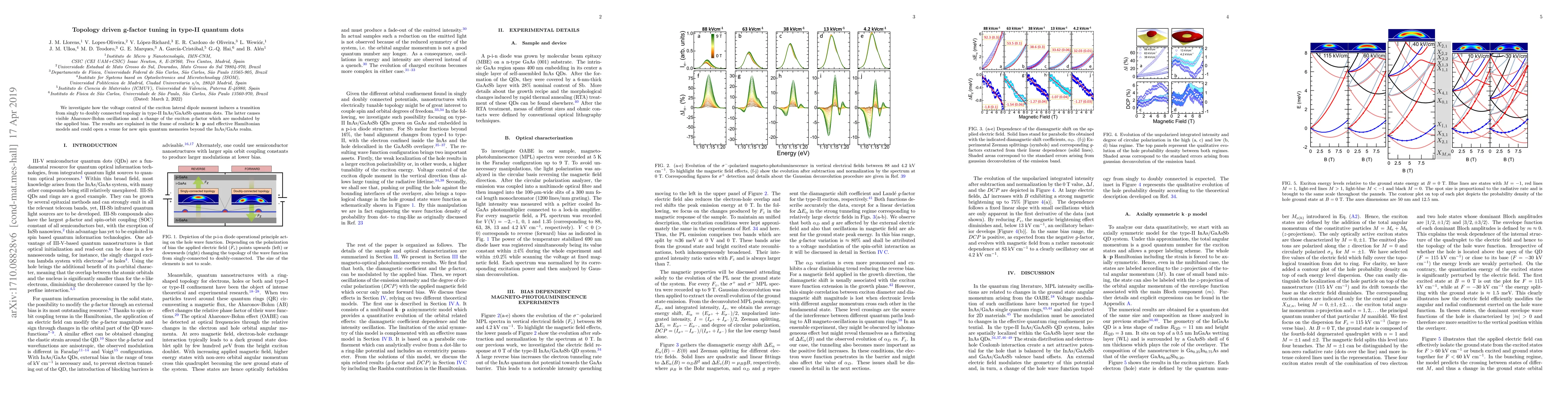 We investigate how the voltage control of the exciton lateral dipole moment induces a transition from singly to doubly connected topology in type II InAs/GaAsSb quantum dots. The latter causes visible Aharonov-Bohm oscillations and a change of the exciton g-factor which are modulated by the applied bias. The results are explained in the frame of realistic $\mathbf{k}\cdot\mathbf{p}$ and effective Hamiltonian models and could open a venue for new spin quantum memories beyond the InAs/GaAs realm.