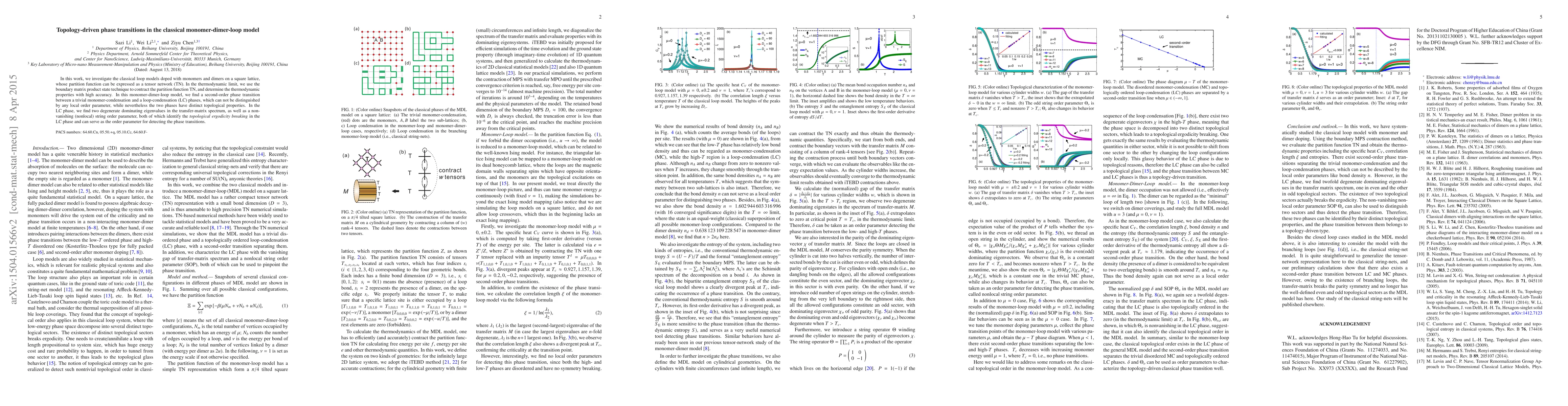 In this work, we investigate the classical loop models doped with monomers and dimers on a square lattice, whose partition function can be expressed as a tensor network (TN). In the thermodynamic limit, we use the boundary matrix product state technique to contract the partition function TN, and determine the thermodynamic properties with high accuracy. In this monomer-dimer-loop model, we find a second-order phase transition between a trivial monomer-condensation and a loop-condensation (LC) phases, which can not be distinguished by any local order parameter, while nevertheless the two phases have distinct topological properties. In the LC phase, we find two degenerate dominating eigenvalues in the transfer-matrix spectrum, as well as a non-vanishing (nonlocal) string order parameter, both of which identify the \textit{topological ergodicity breaking} in the LC phase and can serve as the order parameter for detecting the phase transitions.