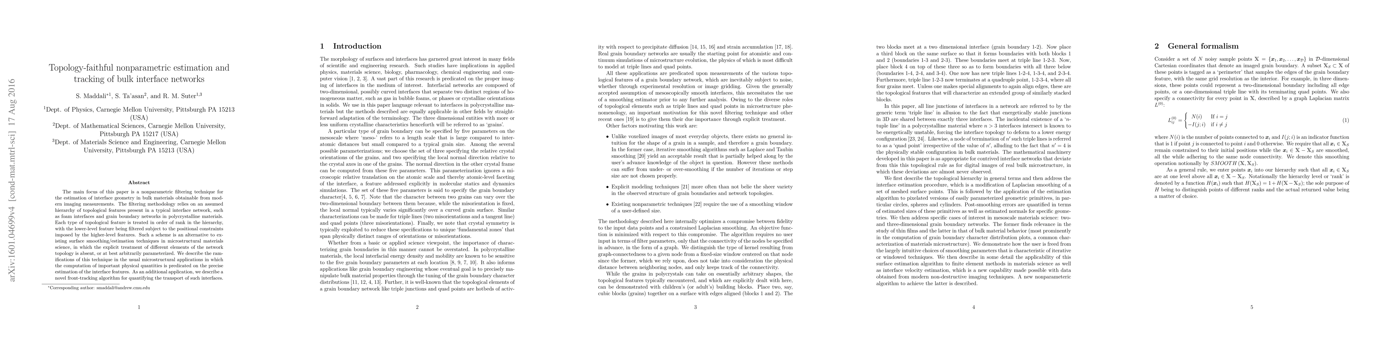 The main focus of this paper is a nonparametric filtering technique for the estimation of interface geometry in bulk materials obtainable from modern imaging measurements. The filtering methodology relies on an assumed hierarchy of topological features present in a typical interface network, such as foam interfaces and grain boundary networks in polycrystalline materials. Each type of topological feature is treated in order of rank in the hierarchy, with the lower-level feature being filtered subject to the positional constraints imposed by the higher-level features. Such a scheme is an alternative to existing surface smoothing/estimation techniques in microstructural materials science, in which the explicit treatment of different elements of the network topology is absent, or at best arbitrarily parameterized. We describe the ramifications of this technique in the usual microstructural applications in which the computation of important physical quantities is predicated on the precise estimation of the interface features. As an additional application, we describe a novel front-tracking algorithm for quantifying the transport of such interfaces.