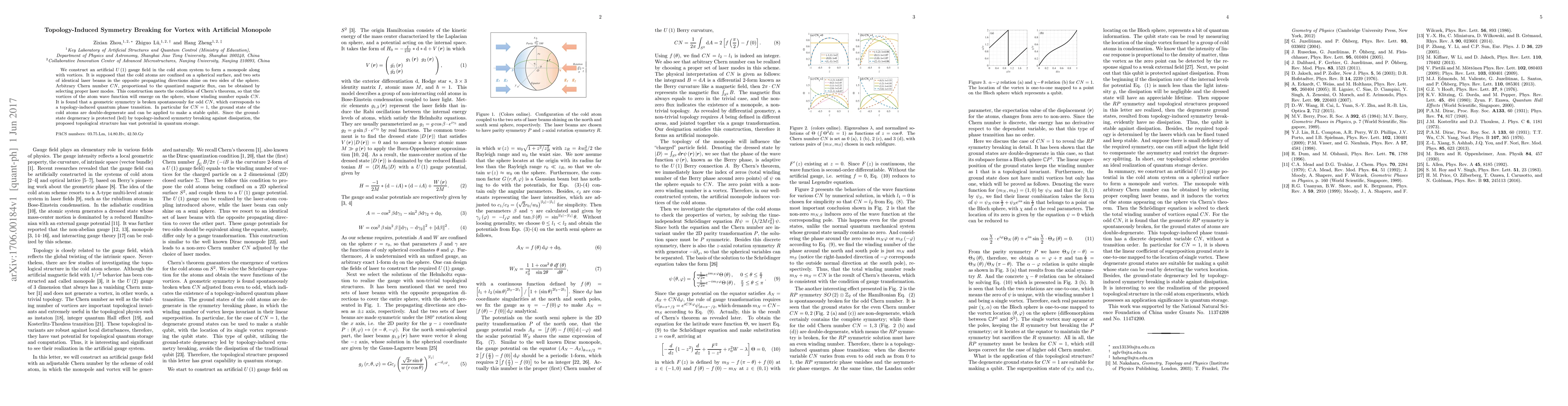 We construct an artificial U(1) gauge field in the cold atom system to form a monopole along with vortices. It is supposed that the cold atoms are confined on a spherical surface, and two sets of identical laser beams in the opposite propagating directions shine on two sides of the sphere. Arbitrary Chern number CN, proportional to the quantized magnetic flux, can be obtained by selecting proper laser modes. This construction meets the condition of Chern's theorem, so that the vortices of the atom wave function will emerge on the sphere, whose winding number equals CN. It is found that a geometric symmetry is broken spontaneously for odd CN, which corresponds to a topology-induced quantum phase transition. In particular for CN=1, the ground state of the cold atoms are double-degenerate and can be applied to make a stable qubit. Since the ground-state degeneracy is protected by topology-induced symmetry breaking against dissipation, the proposed topological structure has vast potential in quantum storage.