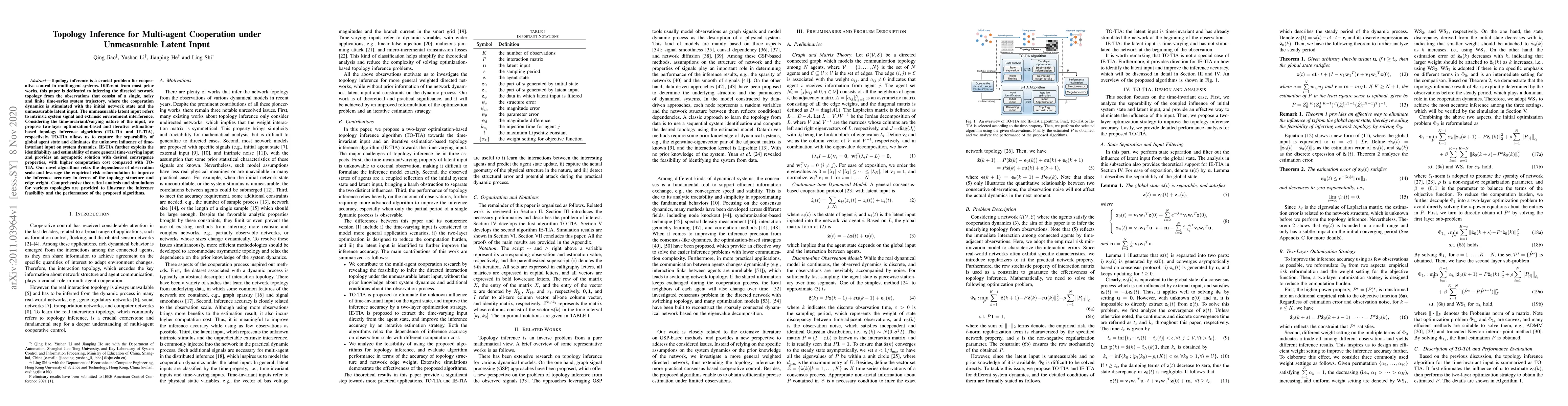 Topology inference is a crucial problem for cooperative control in multi-agent systems. Different from most prior works, this paper is dedicated to inferring the directed network topology from the observations that consist of a single, noisy and finite time-series system trajectory, where the cooperation dynamics is stimulated with the initial network state and the unmeasurable latent input. The unmeasurable latent input refers to intrinsic system signal and extrinsic environment interference. Considering the time-invariant/varying nature of the input, we propose two-layer optimization-based and iterative estimation based topology inference algorithms (TO-TIA and IE-TIA), respectively. TO-TIA allows us to capture the separability of global agent state and eliminates the unknown influence of time-invariant input on system dynamics. IE-TIA further exploits the identifiability and estimability of more general time-varying input and provides an asymptotic solution with desired convergence properties, with higher computation cost compared with TO-TIA. Our novel algorithms relax the dependence of observation scale and leverage the empirical risk reformulation to improve the inference accuracy in terms of the topology structure and edge weight. Comprehensive theoretical analysis and simulations for various topologies are provided to illustrate the inference feasibility and the performance of the proposed algorithms.