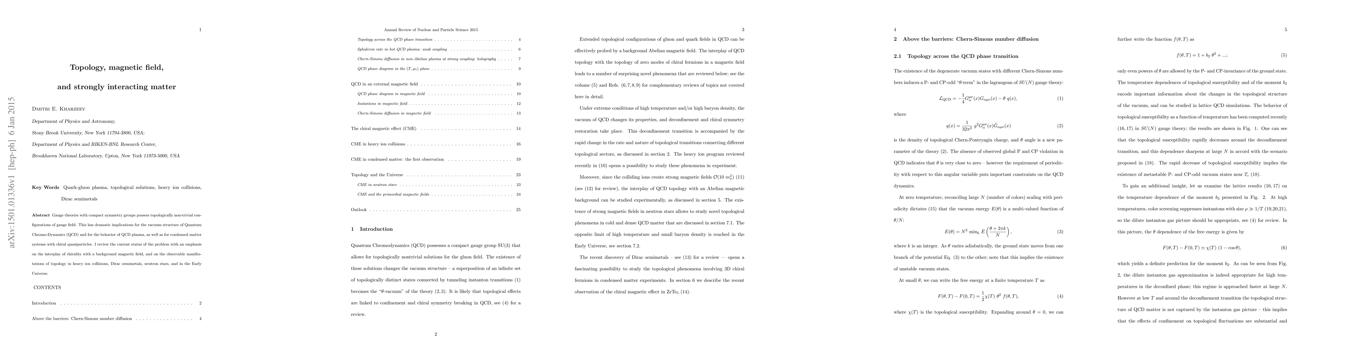 Gauge theories with compact symmetry groups possess topologically non-trivial configurations of gauge field. This has dramatic implications for the vacuum structure of Quantum Chromo-Dynamics (QCD) and for the behavior of QCD plasma, as well as for condensed matter systems with chiral quasiparticles. I review the current status of the problem with an emphasis on the interplay of chirality with a background magnetic field, and on the observable manifestations of topology in heavy ion collisions, Dirac semimetals, neutron stars, and in the Early Universe.