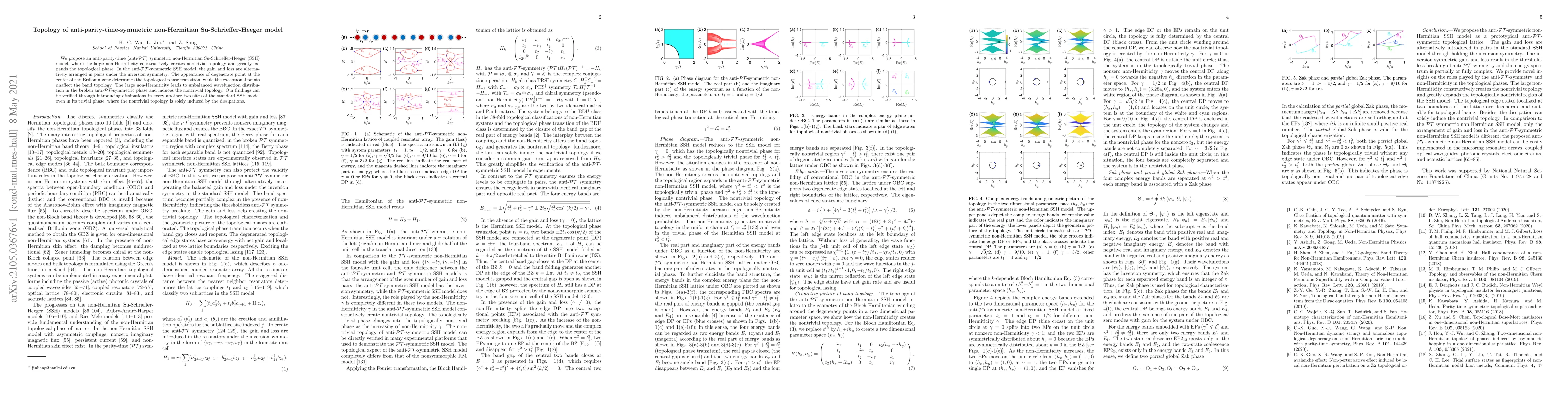 This paper proposes an anti-parity-time symmetric non-Hermitian Su-Schrieffer-Heeger (SSH) model, demonstrating how large non-Hermiticity can create nontrivial topology and expand the topological phase. The model's degenerate point at the Brillouin zone center induces topological phase transitions, while exceptional points do not affect band topology.