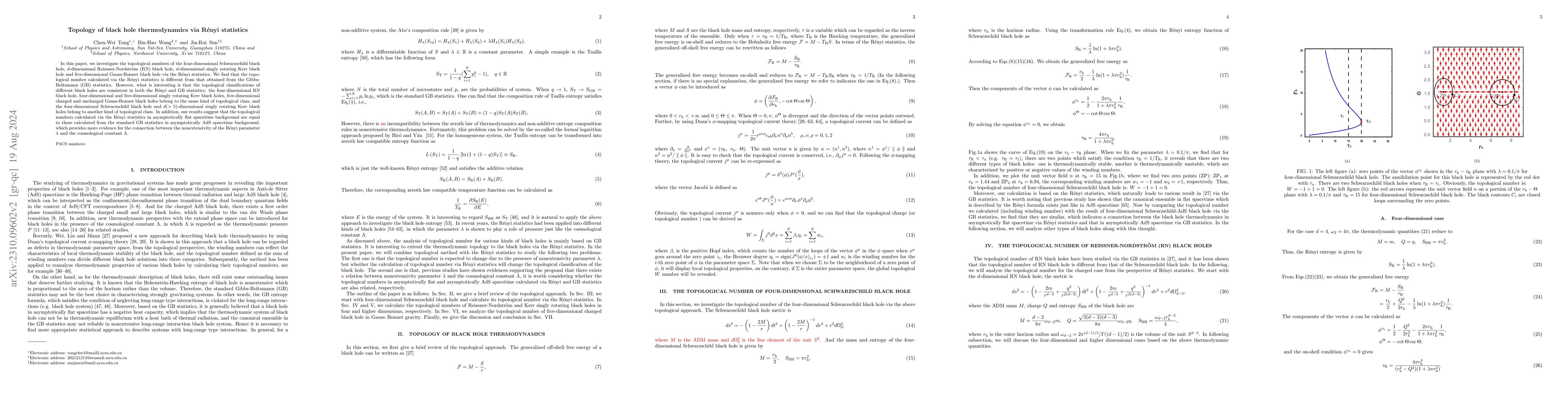This paper explores the topological classifications of various black holes using R\'enyi statistics, revealing distinct topological numbers compared to Gibbs-Boltzmann statistics. Despite this, the classifications remain consistent across both statistical methods, suggesting a deeper connection between R\'enyi statistics and the cosmological constant in different spacetime backgrounds.