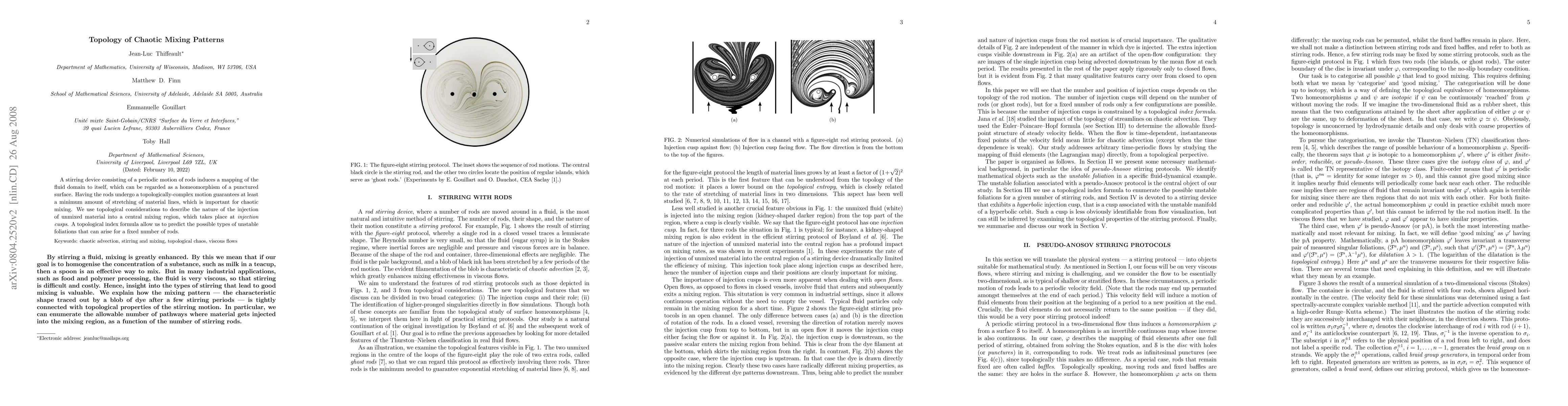 A stirring device consisting of a periodic motion of rods induces a mapping of the fluid domain to itself, which can be regarded as a homeomorphism of a punctured surface. Having the rods undergo a topologically-complex motion guarantees at least a minimum amount of stretching of material lines, which is important for chaotic mixing. We use topological considerations to describe the nature of the injection of unmixed material into a central mixing region, which takes place at injection cusps. A topological index formula allow us to predict the possible types of unstable foliations that can arise for a fixed number of rods.