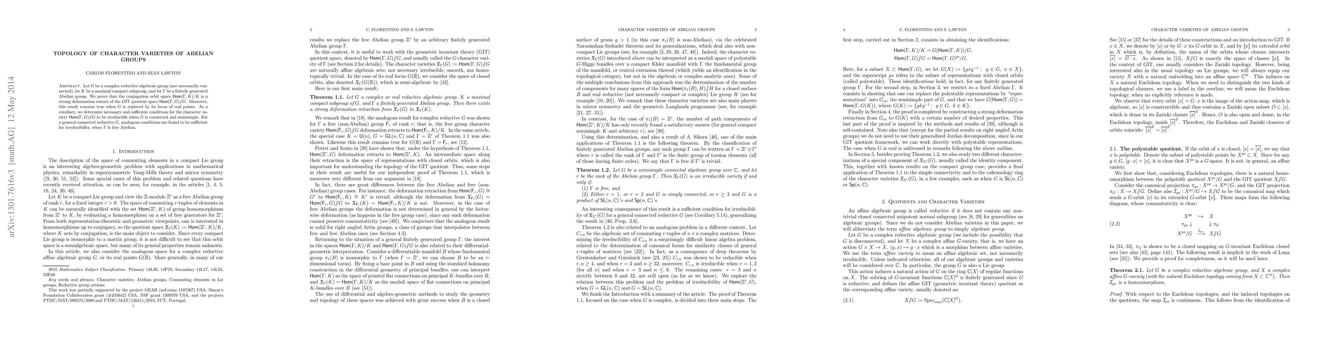 Let G be a complex reductive algebraic group (not necessarily connected), let K be a maximal compact subgroup, and let A be a finitely generated Abelian group. We prove that the conjugation orbit space Hom(A,K)/K is a strong deformation retract of the GIT quotient space Hom(A,G)//G. As a corollary, we determine necessary and sufficient conditions for the character variety Hom(A,G)//G to be irreducible when G is connected and semisimple. For a general connected reductive G, analogous conditions are found to be sufficient for irreducibility, when A is free abelian.