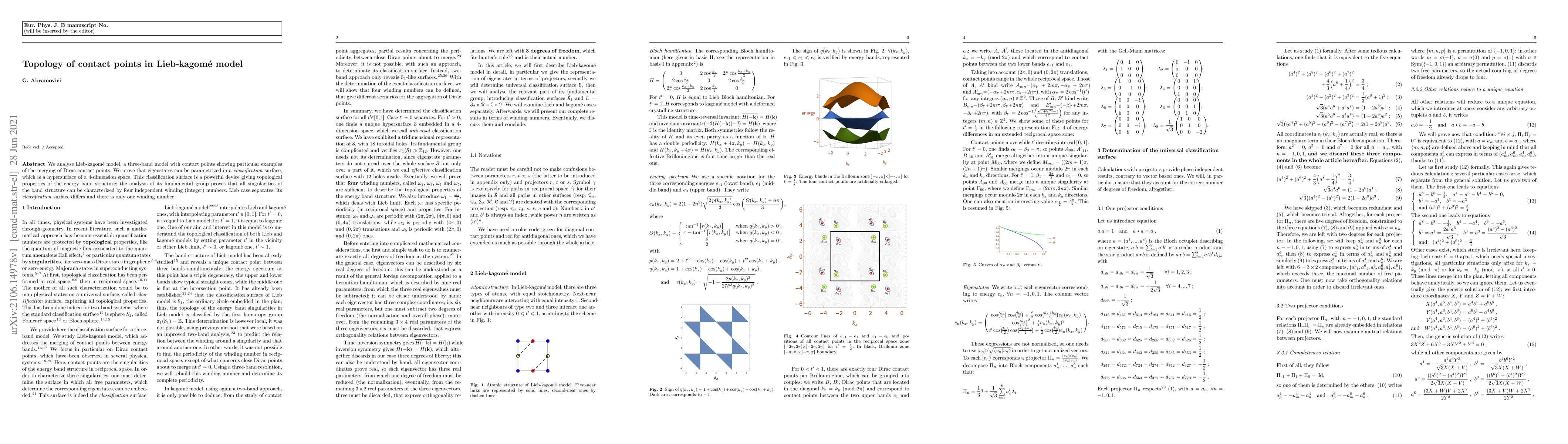 We analyse Lieb-kagom\'e model, a three-band model with contact points showing particular examples of the merging of Dirac contact points. We prove that eigenstates can be parametrized in a classification surface, which is a hypersurface of a 4-dimension space. This classification surface is a powerful device giving topological properties of the energy band structure; the analysis of its fundamental group proves that all singularities of the band structure can be characterized by four independent winding (integer) numbers. Lieb case separates: its classification surface differs and there is only one winding number.