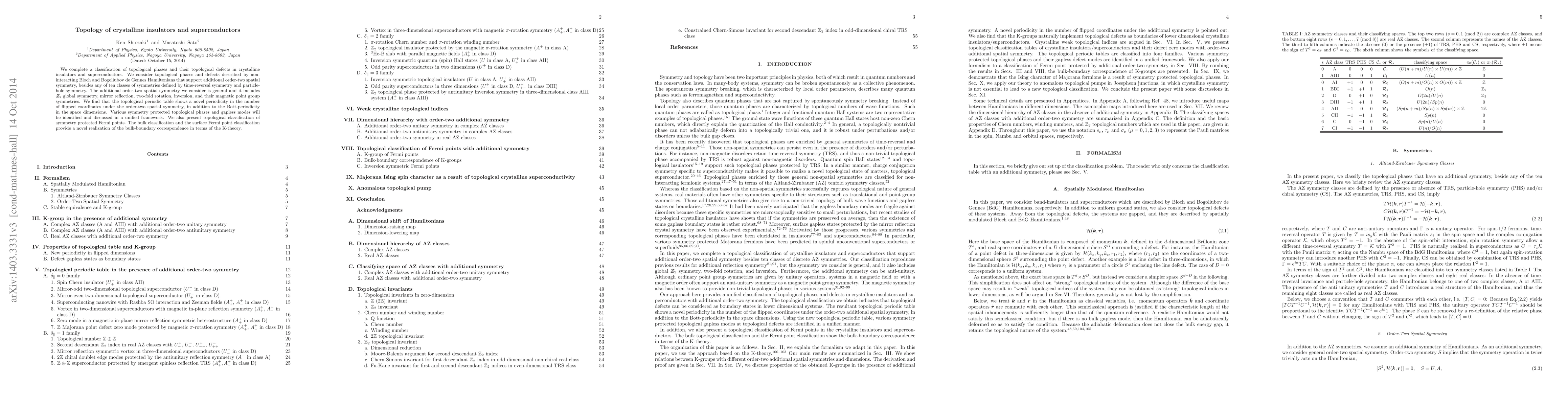 We complete a classification of topological phases and their topological defects in crystalline insulators and superconductors. We consider topological phases and defects described by non-interacting Bloch and Bogoliubov de Gennes Hamiltonians that support additional order-two spatial symmetry, besides any of ten classes of symmetries defined by time-reversal symmetry and particle-hole symmetry. The additional order-two spatial symmetry we consider is general and it includes $Z_2$ global symmetry, mirror reflection, two-fold rotation, inversion, and their magnetic point group symmetries. We find that the topological periodic table shows a novel periodicity in the number of flipped coordinates under the order-two spatial symmetry, in addition to the Bott-periodicity in the space dimensions. Various symmetry protected topological phases and gapless modes will be identified and discussed in a unified framework. We also present topological classification of symmetry protected Fermi points. The bulk classification and the surface Fermi point classification provide a novel realization of the bulk-boundary correspondence in terms of the K-theory.