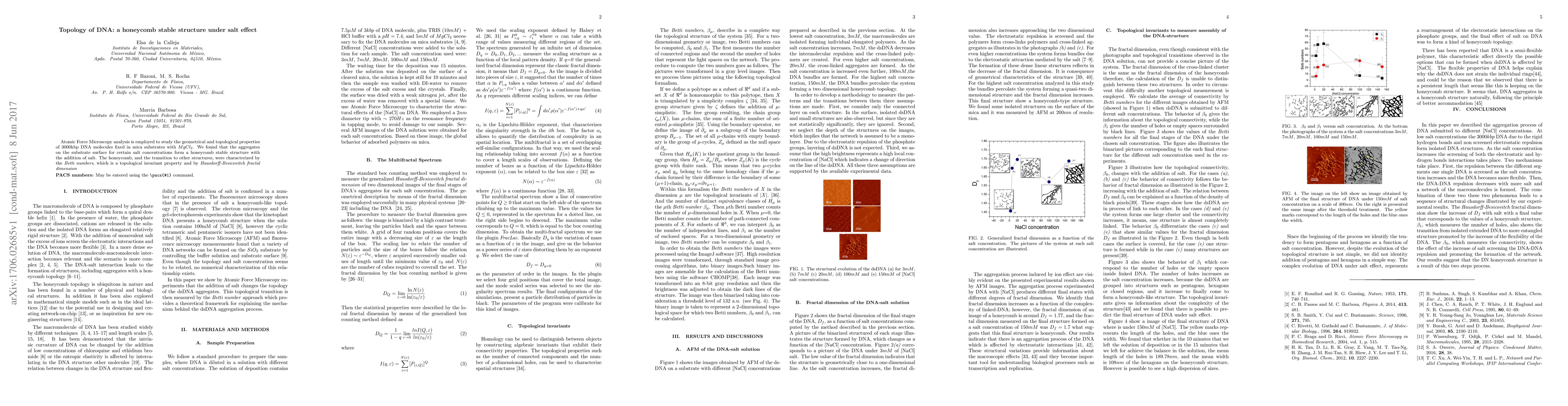 Researchers used atomic force microscopy to study DNA molecules under different salt concentrations, discovering a honeycomb stable structure that forms at certain salt levels. This unique structure was characterized using topological invariant properties and fractal dimensions.
