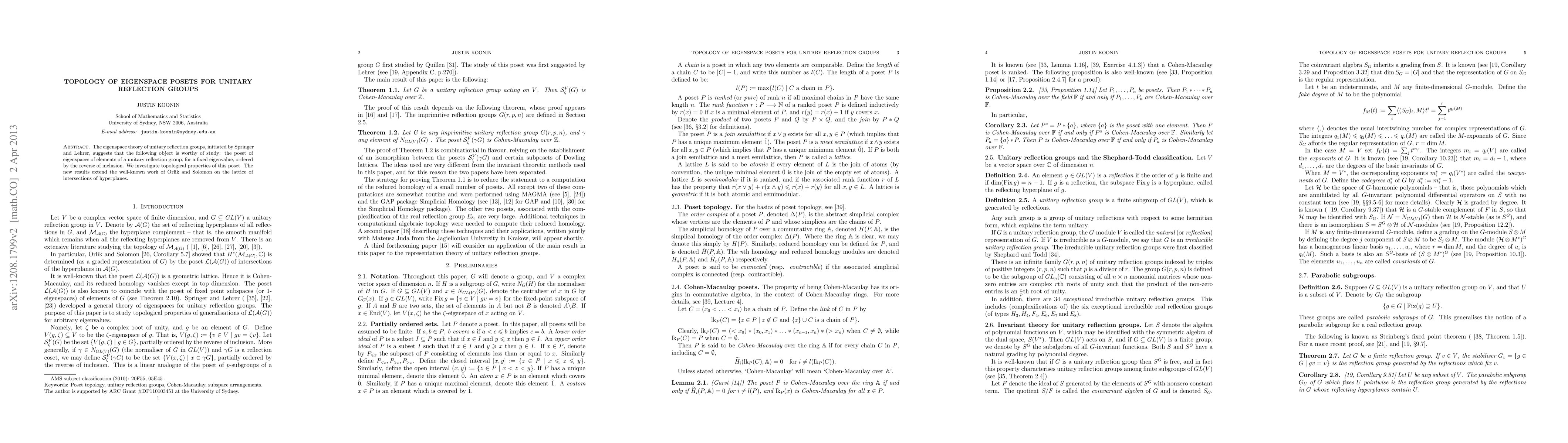 This paper studies the topological properties of the poset formed by eigenspaces of unitary reflection groups for a fixed eigenvalue, ordered by reverse inclusion. It extends Orlik and Solomon's work on the lattice of hyperplane intersections.