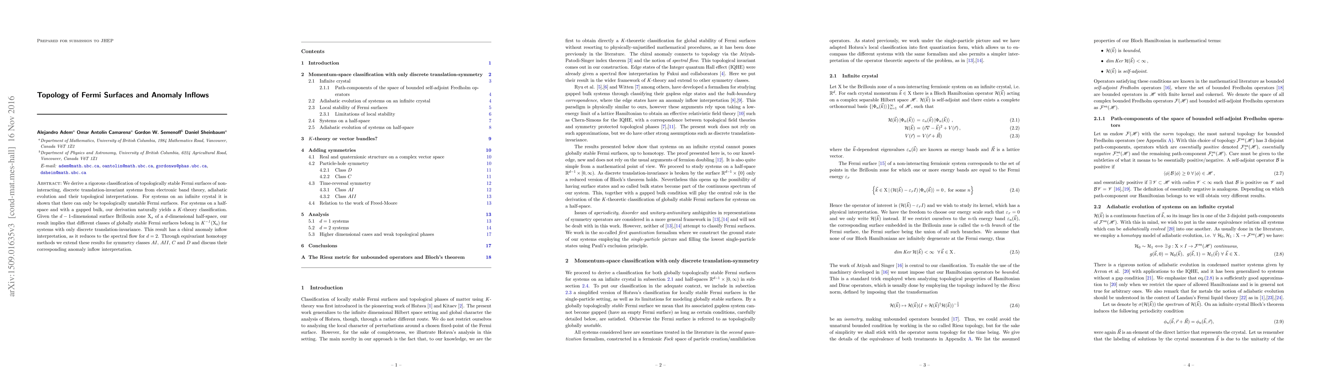 We derive a rigorous classification of topologically stable Fermi surfaces of non-interacting, discrete translation-invariant systems from electronic band theory, adiabatic evolution and their topological interpretations. For systems on an infinite crystal it is shown that there can only be topologically unstable Fermi surfaces. For systems on a half- space and with a gapped bulk, our derivation naturally yields a $\mathit{K}$-theory classification. Given the $d-1$-dimensional surface Brillouin zone $\mathrm{X}_{s}$ of a $d$-dimensional half-space, our result implies that different classes of globally stable Fermi surfaces belong in $\mathit{K^{-1}}\mathrm{(X_{s})}$ for systems with only discrete translation-invariance. This result has a chiral anomaly inflow interpretation, as it reduces to the spectral flow for $d = 2$. Through equivariant homotopy methods we extend these results for symmetry classes $AI,\,AII,\, C$ and $D$ and discuss their corresponding anomaly inflow interpretation.