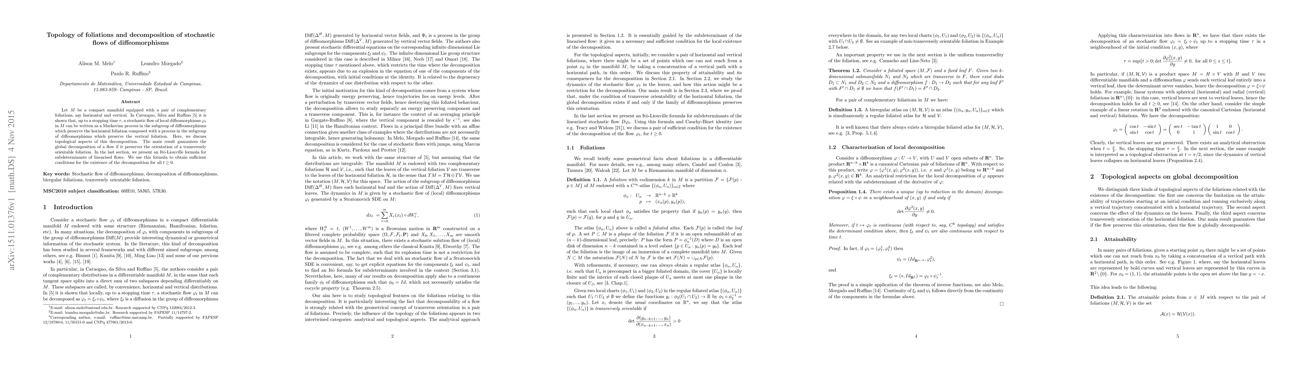 This paper explores the topological decomposition of stochastic flows of diffeomorphisms on a compact manifold with complementary foliations. It proves the global decomposition of such flows if they preserve the orientation of a transversely orientable foliation and provides an Itô-Liouville formula for subdeterminants of linearized flows to establish conditions for the decomposition over all time.