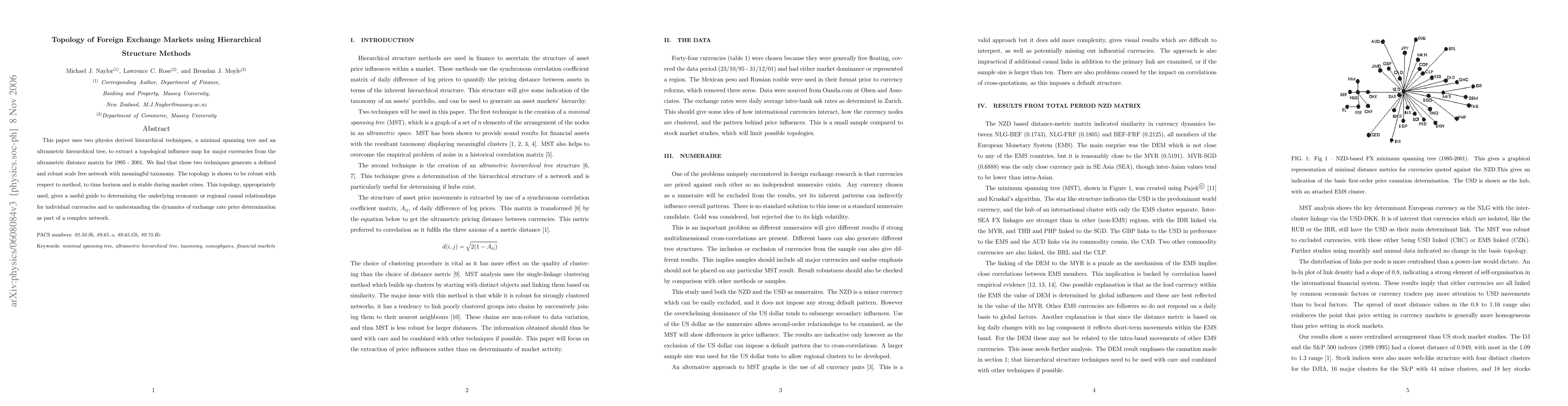 This paper uses two hierarchical techniques, a minimal spanning tree and an ultrametric hierarchical tree, to extract a topological influence map for major currencies from the ultrametric distance matrix for 1996-2001. We find that these two techniques generate a defined and robust scale free network with meaningful taxonomy. The topology is shown to be robust with respect to method, to time horizon and is stable during market crises. This topology, appropriately used, gives a guide to determining the underlying economic or regional causal relationships for individual currencies and will prove useful to understanding the dynamics of exchange rate price determination as part of a complex network.