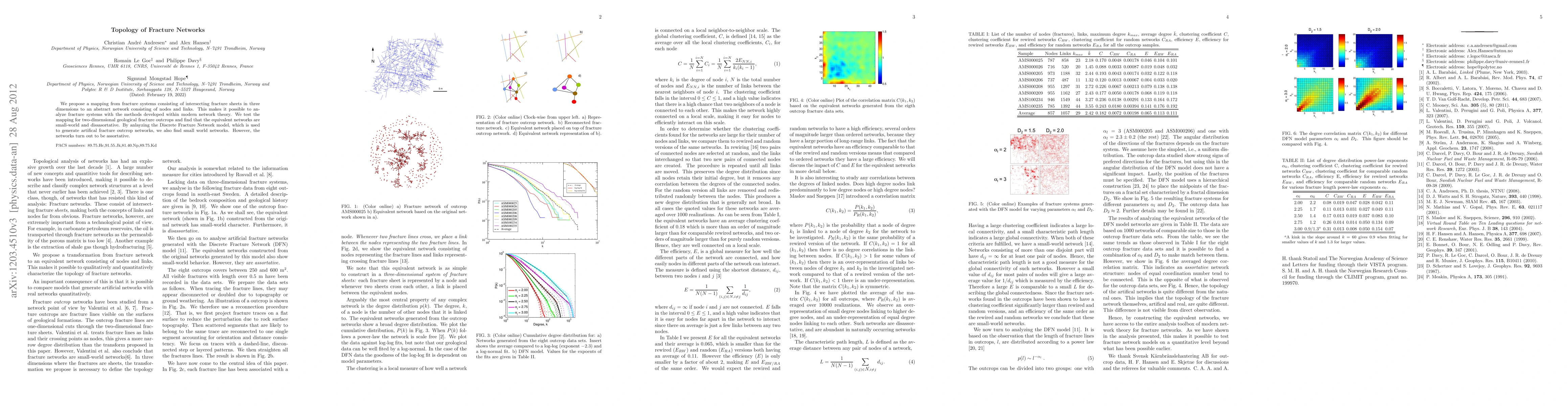 This paper maps three-dimensional fracture systems into abstract networks, enabling analysis using modern network theory. The study finds that natural fracture networks exhibit small-world and disassortative properties, while artificial Discrete Fracture Networks show small-world but assortative characteristics.