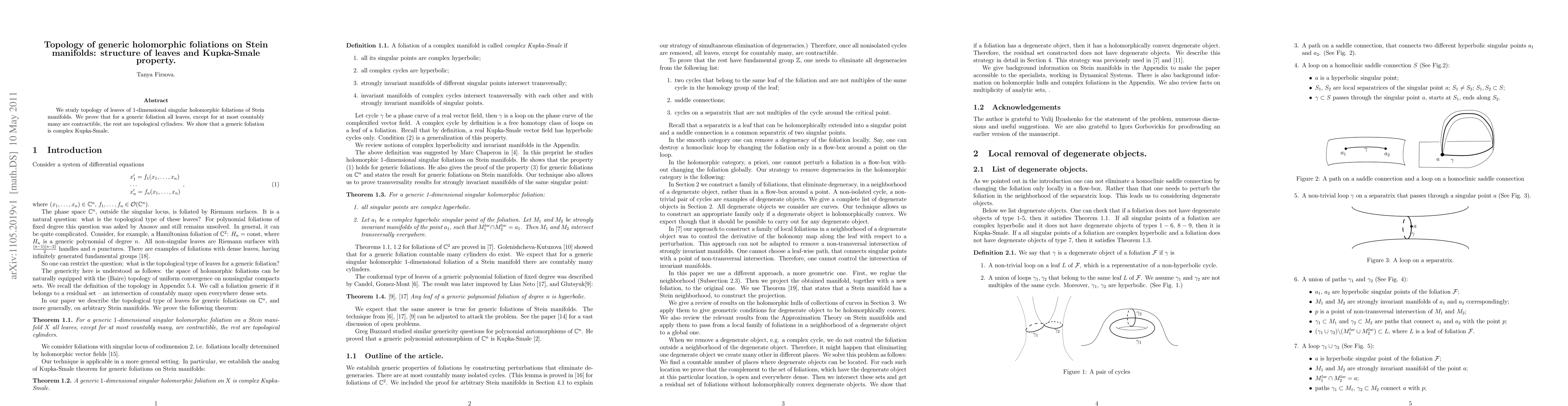 Summary: This paper investigates the topology of leaves in 1-dimensional singular holomorphic foliations on Stein manifolds, demonstrating that most leaves are contractible, while the rest are topological cylinders. It concludes that a generic foliation exhibits the complex Kupka-Smale property.